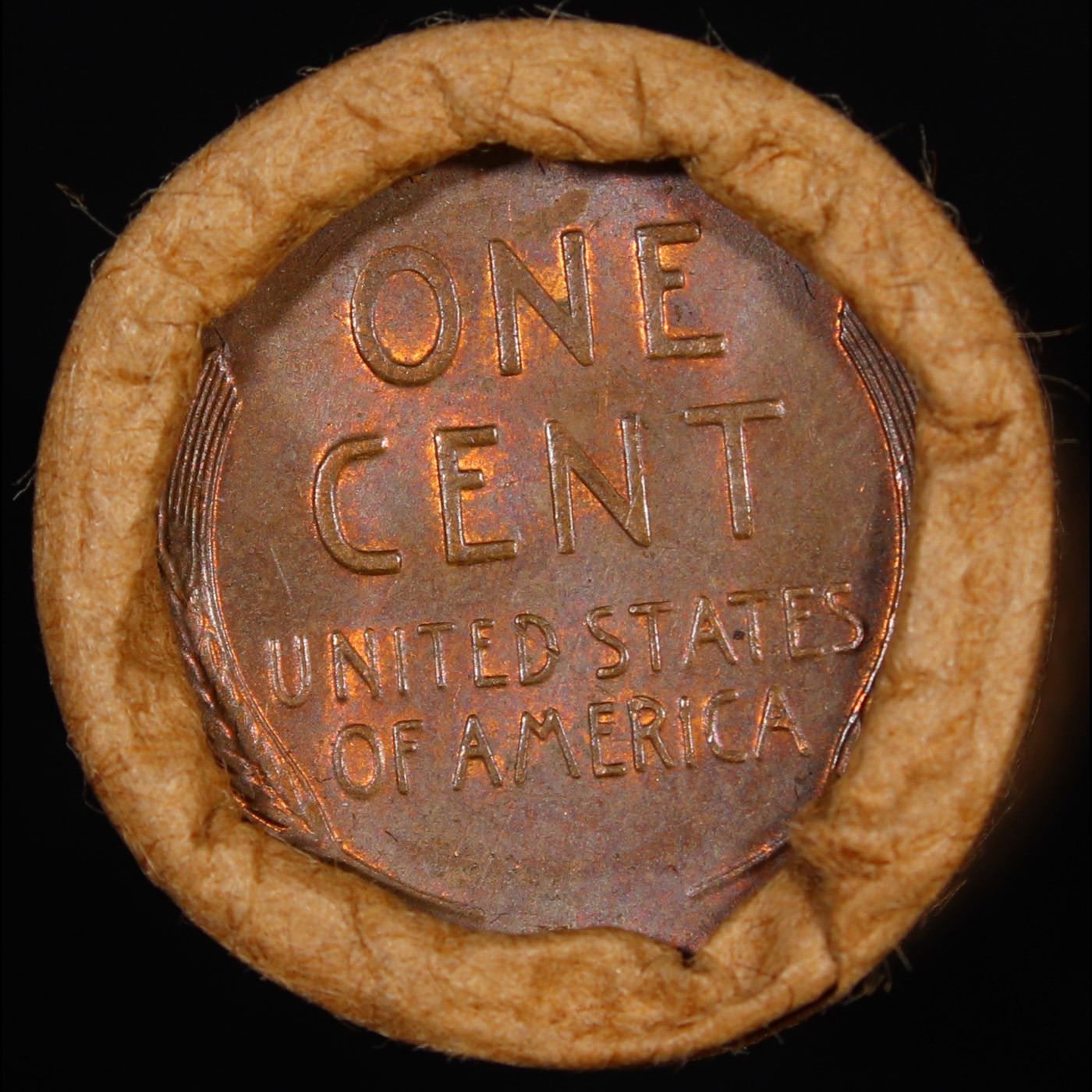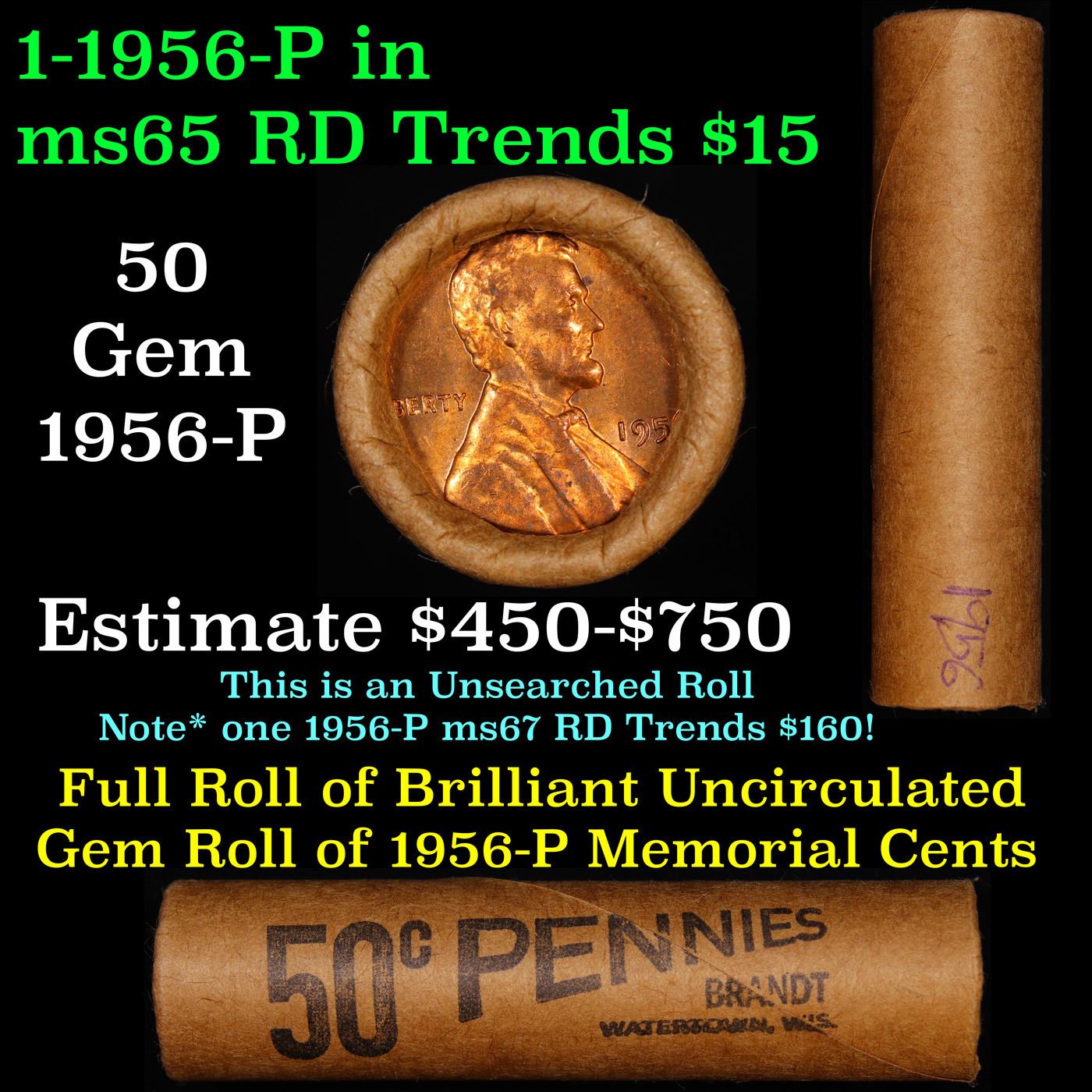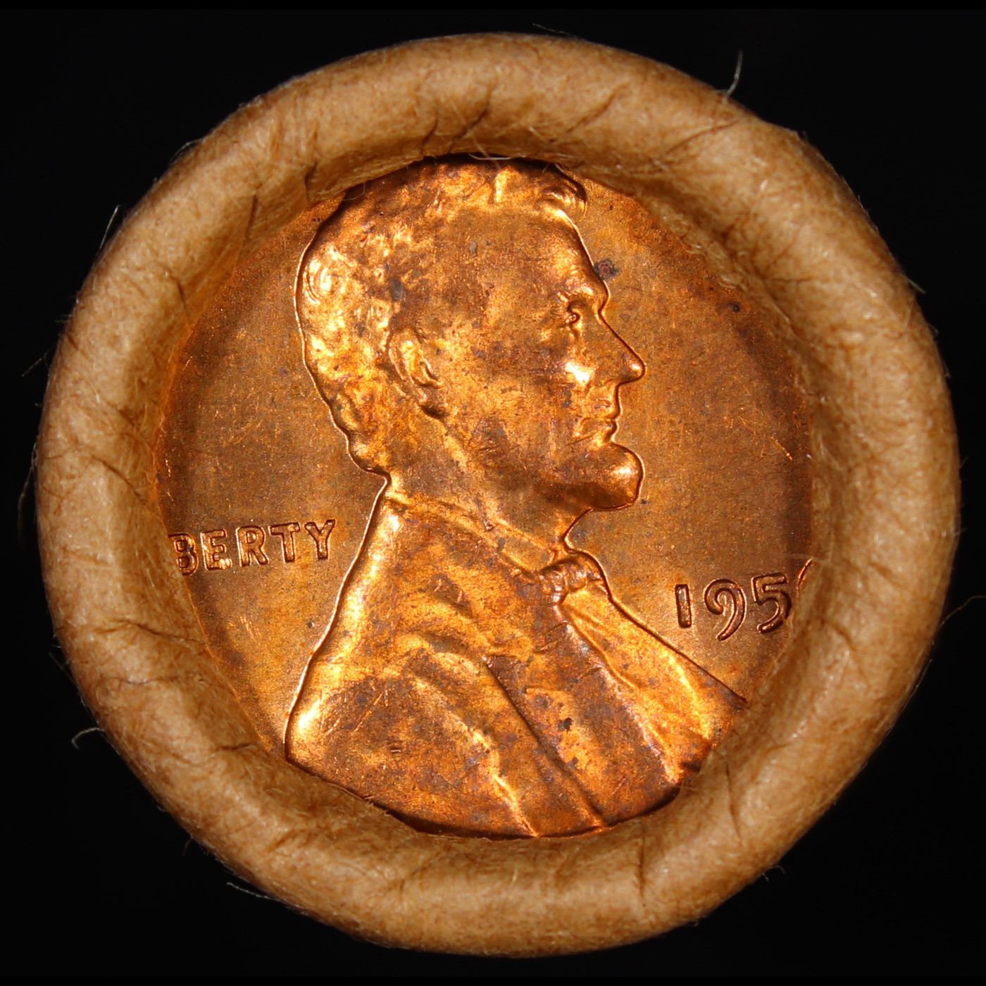 Shotgun Lincoln 1c roll, 1956-p 50 pcs Brandt Wrapper . A terrific Shotgun roll of Lincoln cents. All coins cherry red. Trends ms65 rd