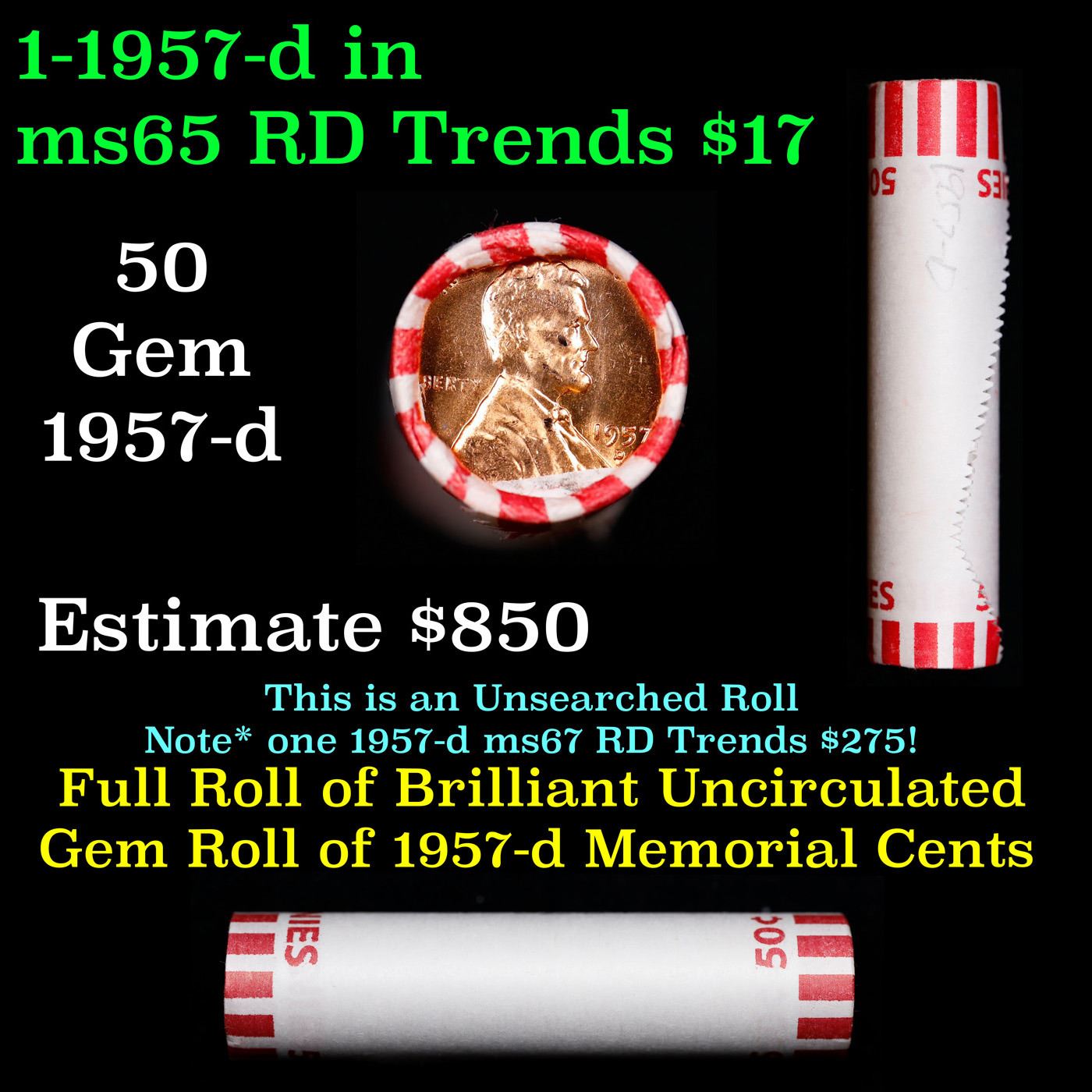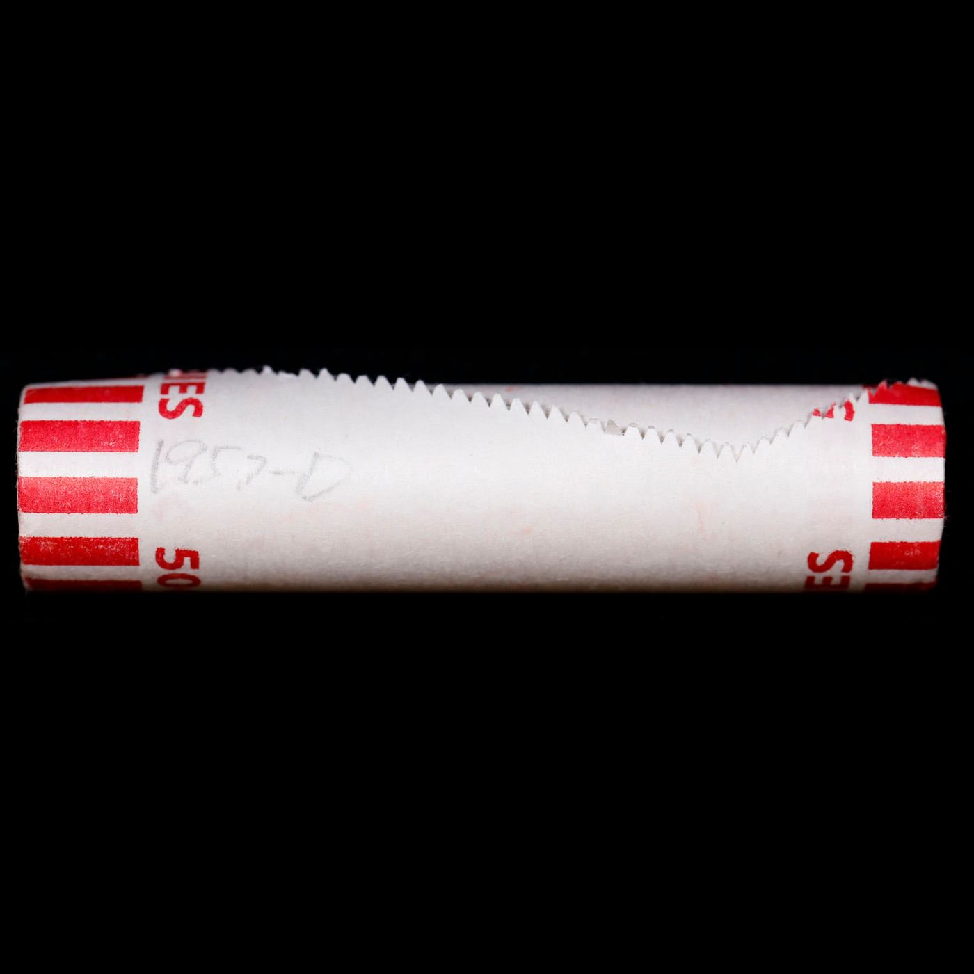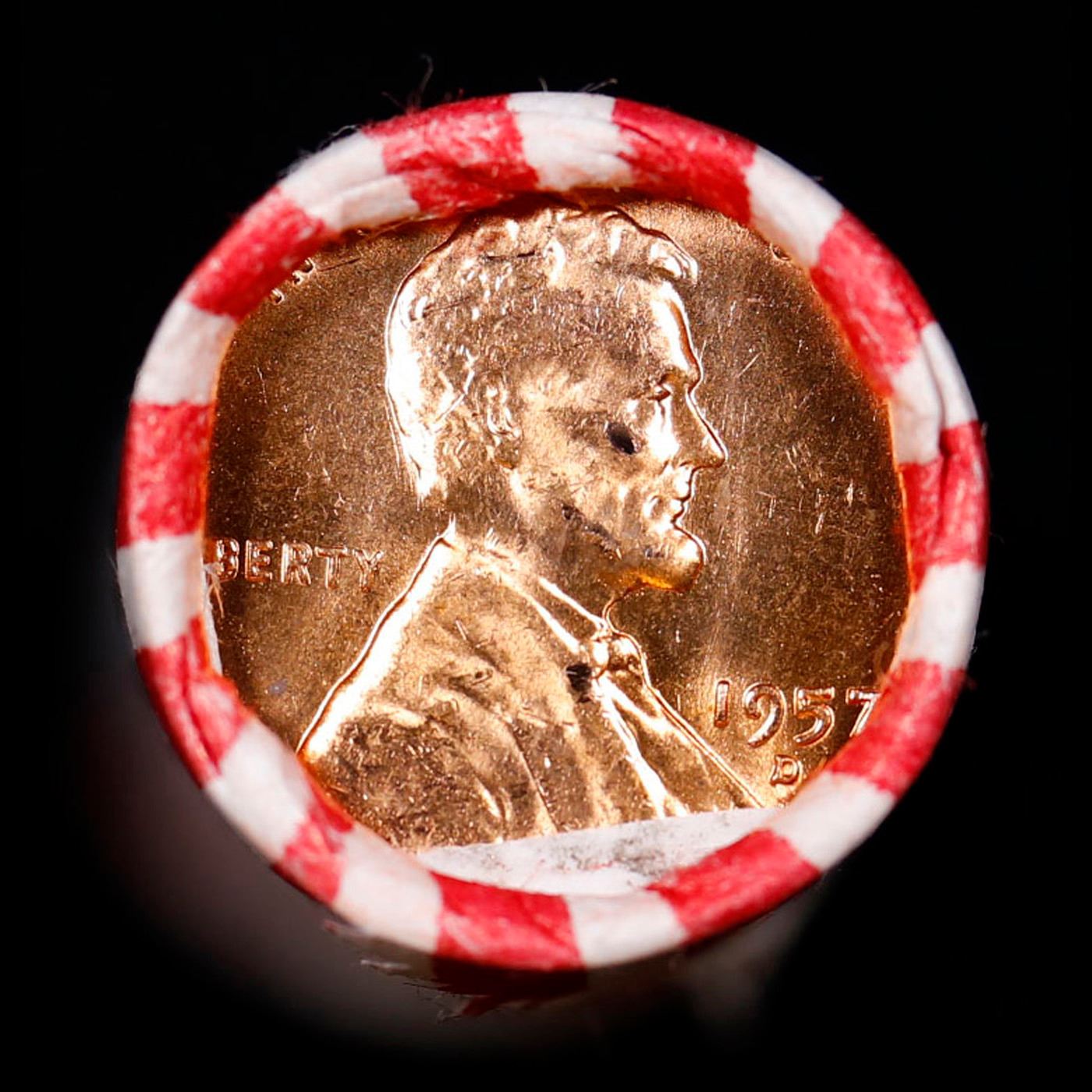 Shotgun Lincoln 1c roll, 1957-d 50 pcs Bank Wrapper.. A terrific Shotgun roll of Lincoln cents. Most if not all coin should be cherry red.