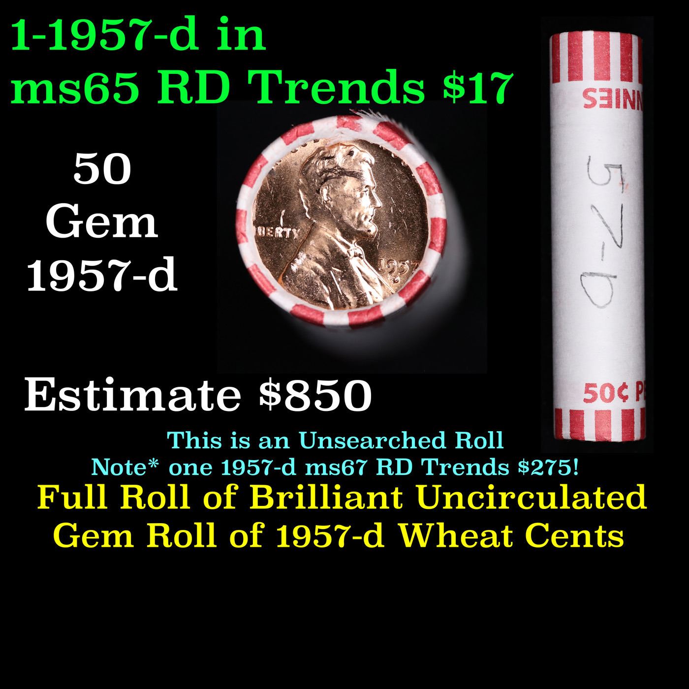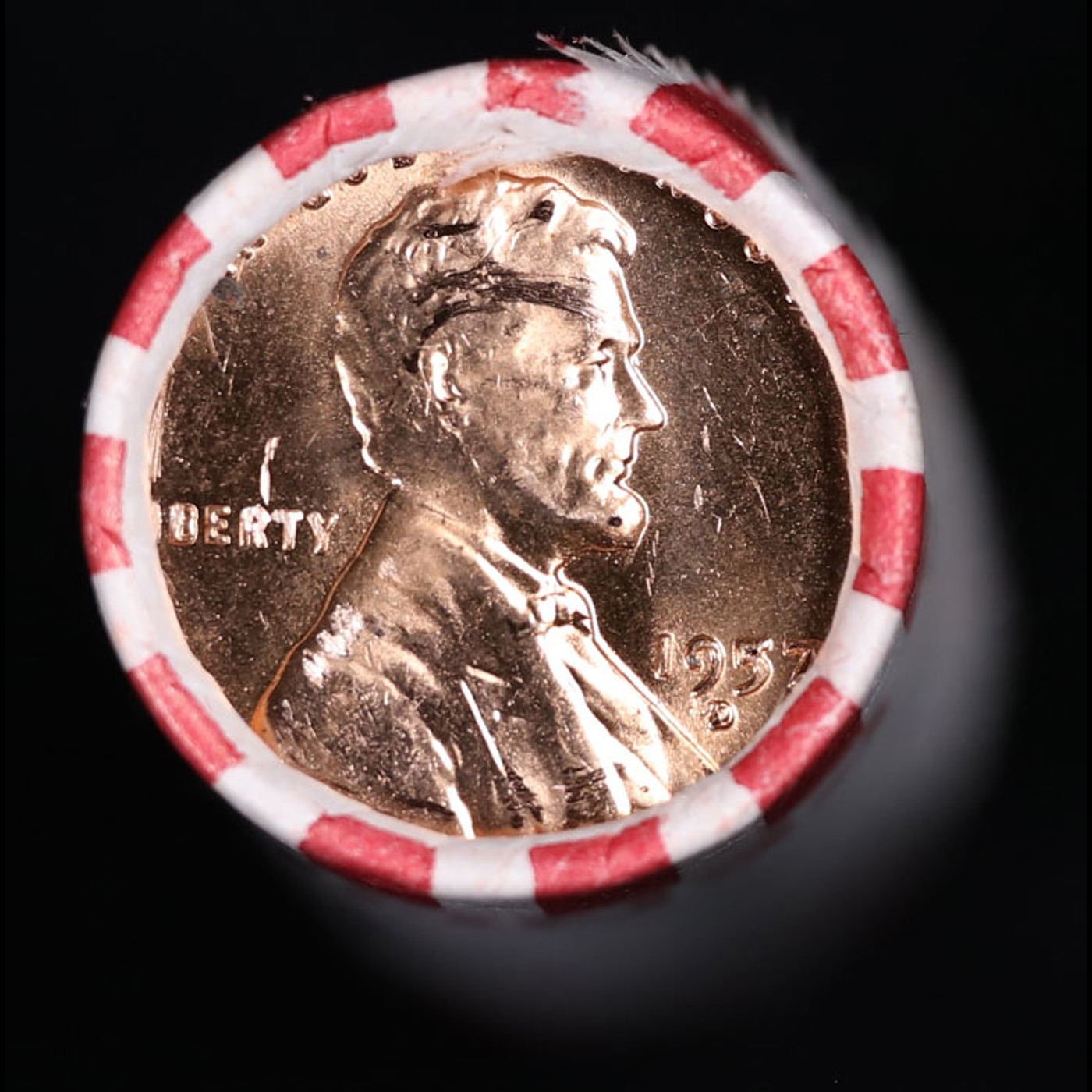 Shotgun Lincoln 1c roll, 1957-d 50 pcs Bank Wrapper.. A terrific Shotgun roll of Lincoln cents. Most if not all coin should be cherry red.