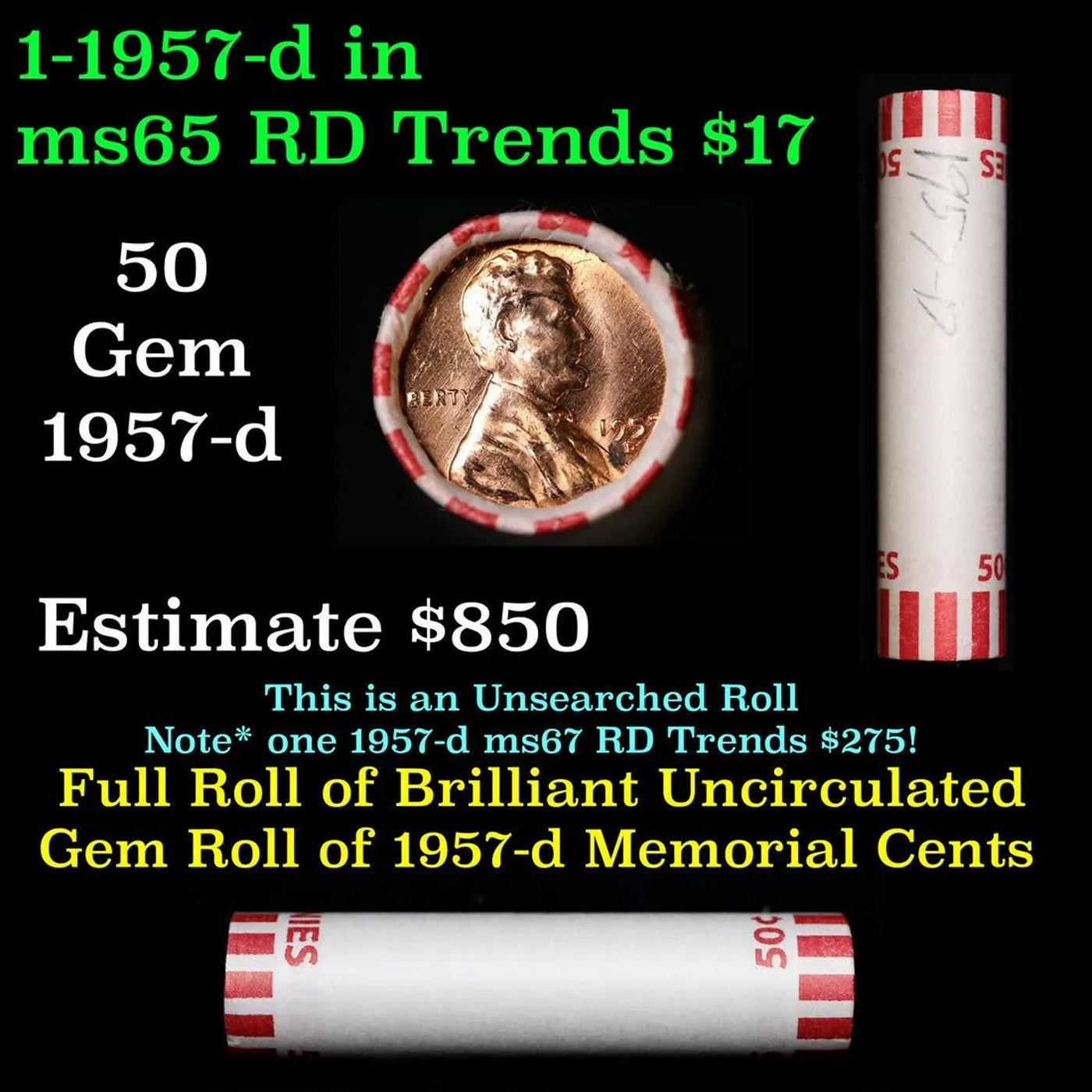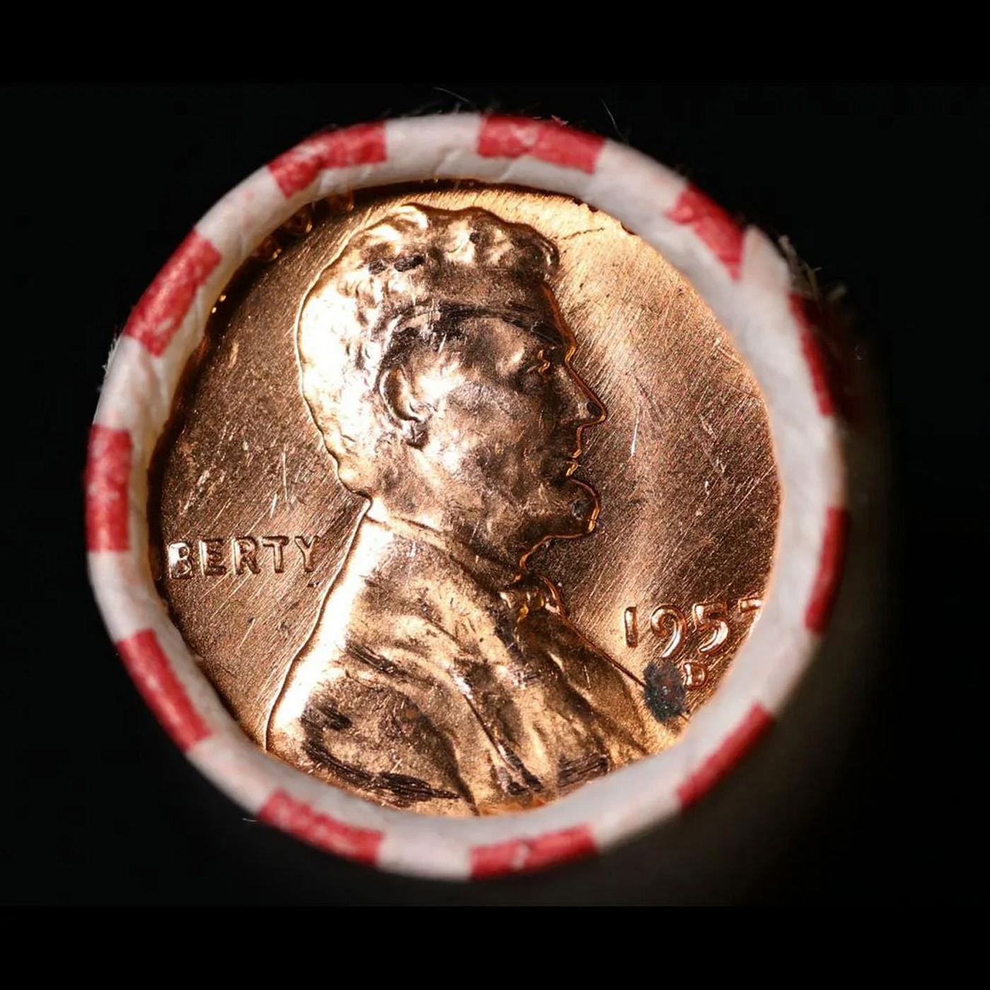 Shotgun Lincoln 1c roll, 1957-d 50 pcs Bank Wrapper.. A terrific Shotgun roll of Lincoln cents. Most if not all coin should be cherry red.