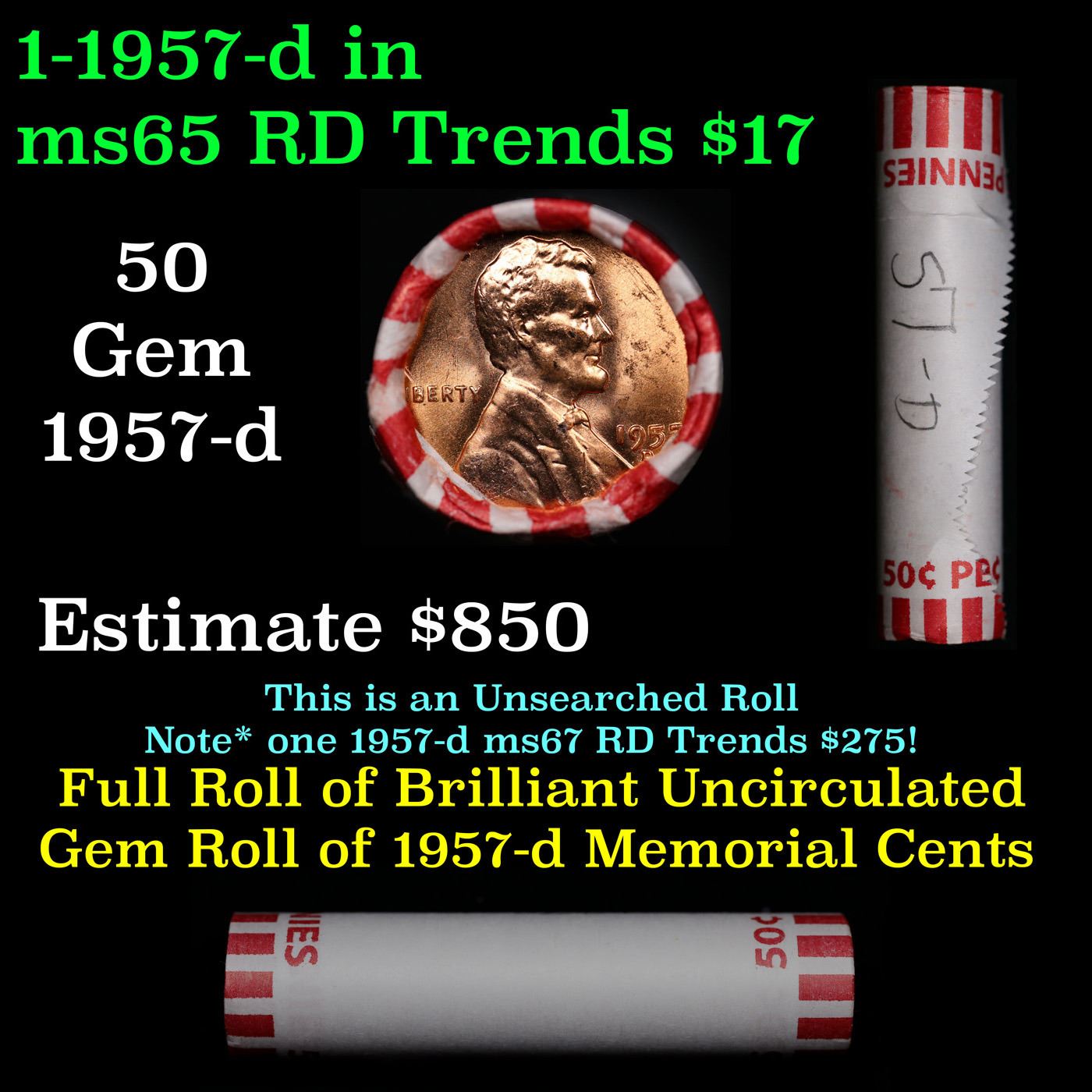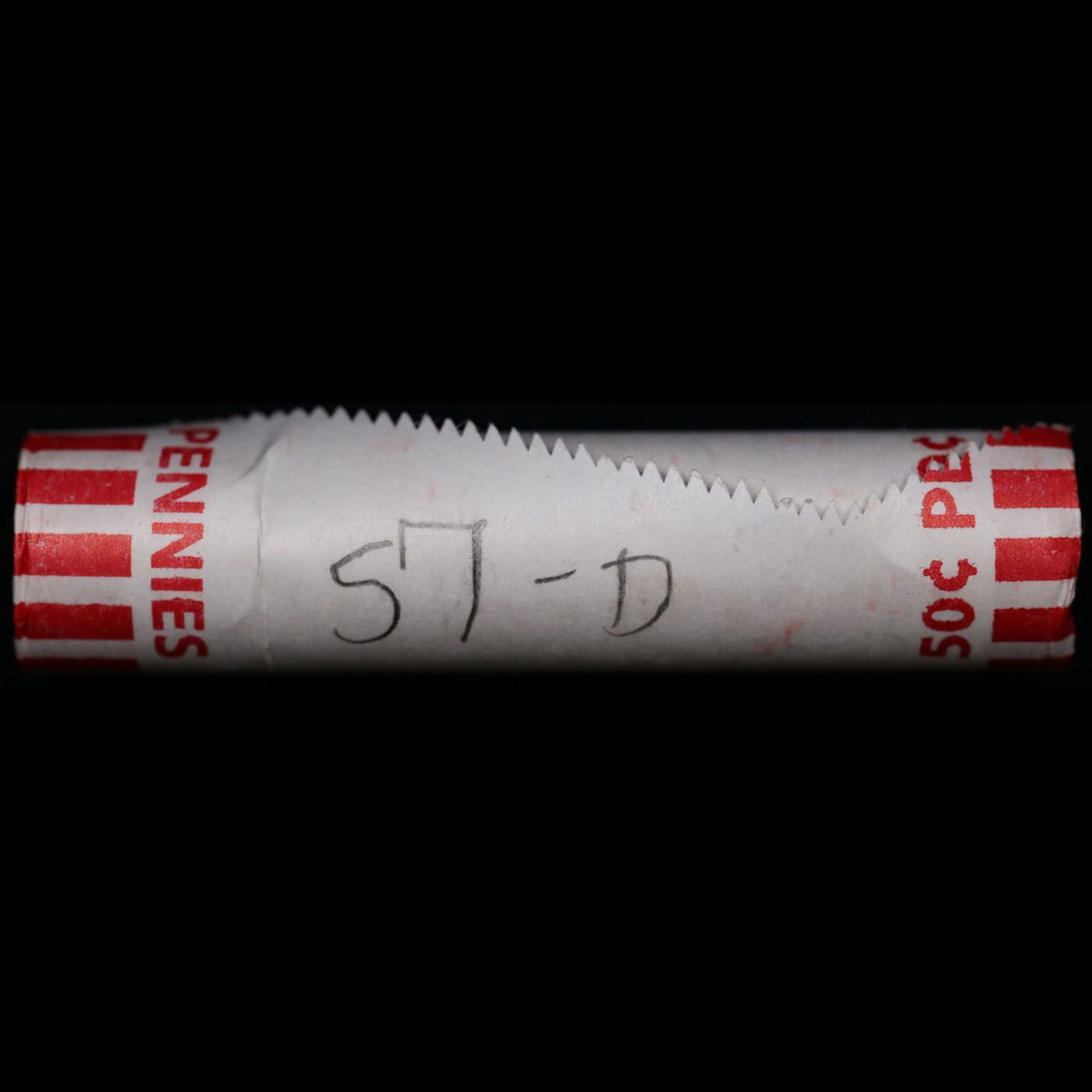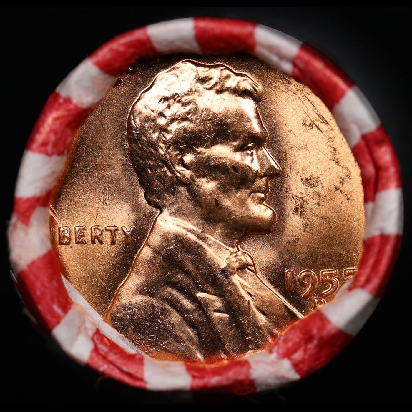 Shotgun Lincoln 1c roll, 1957-d 50 pcs Bank Wrapper.. A terrific Shotgun roll of Lincoln cents. Most if not all coin should be cherry red.
