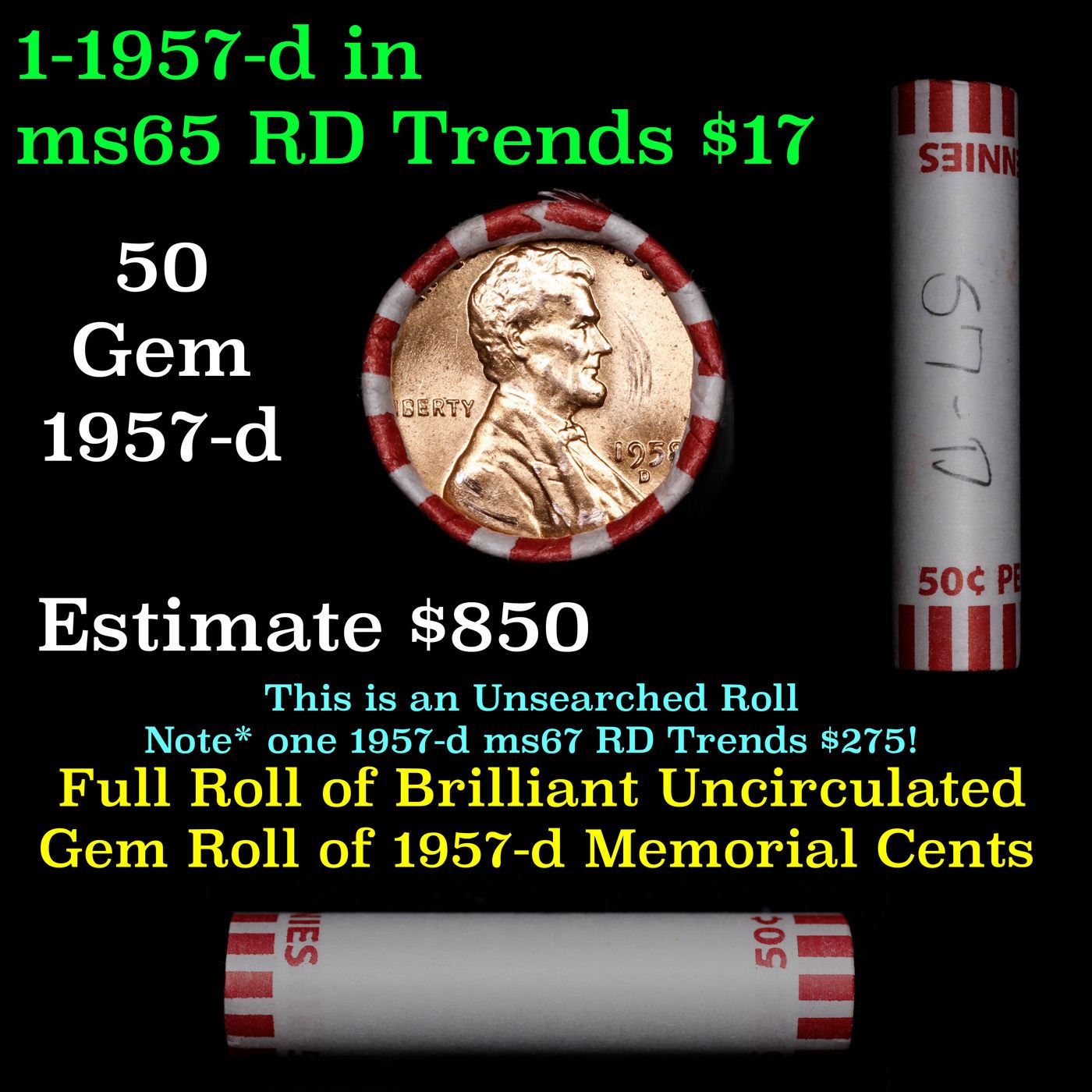 Shotgun Lincoln 1c roll, 1957-d 50 pcs Bank Wrapper.. A terrific Shotgun roll of Lincoln cents. Most if not all coin should be cherry red.