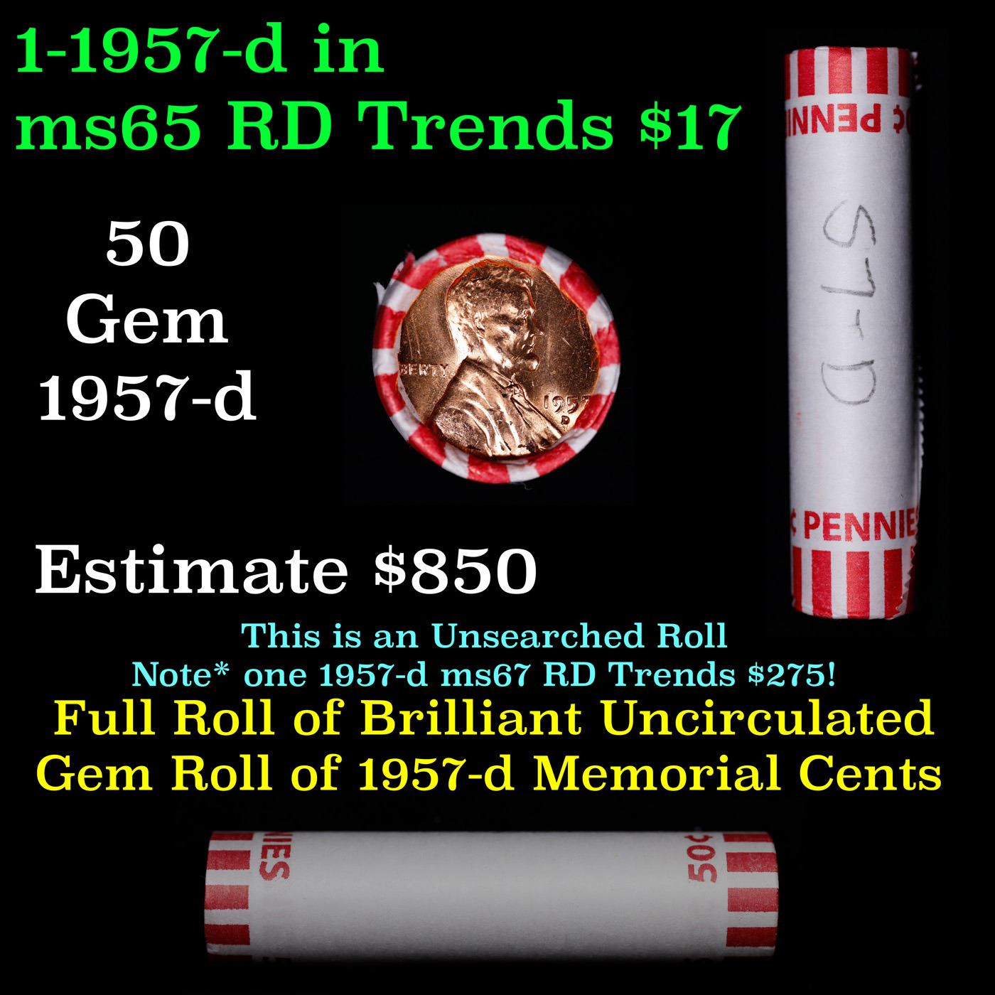 Shotgun Lincoln 1c roll, 1957-d 50 pcs Bank Wrapper.. A terrific Shotgun roll of Lincoln cents. Most if not all coin should be cherry red.