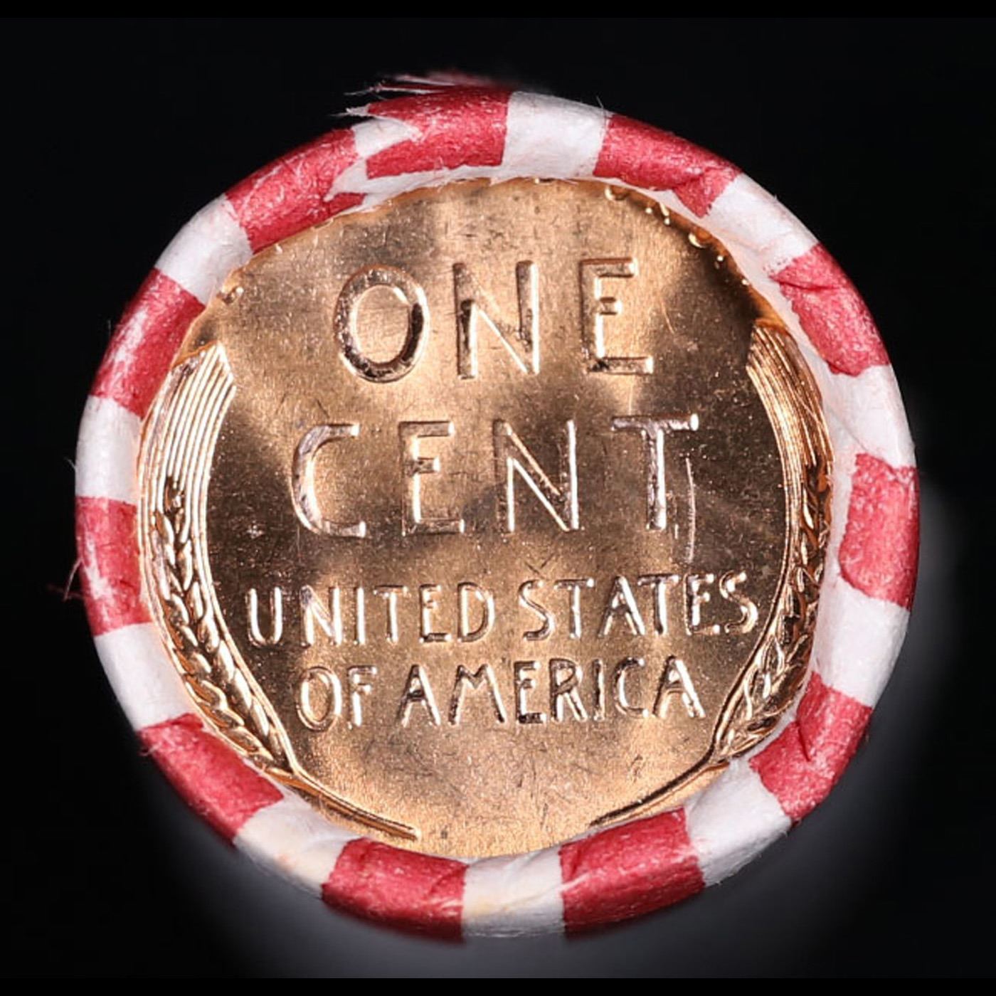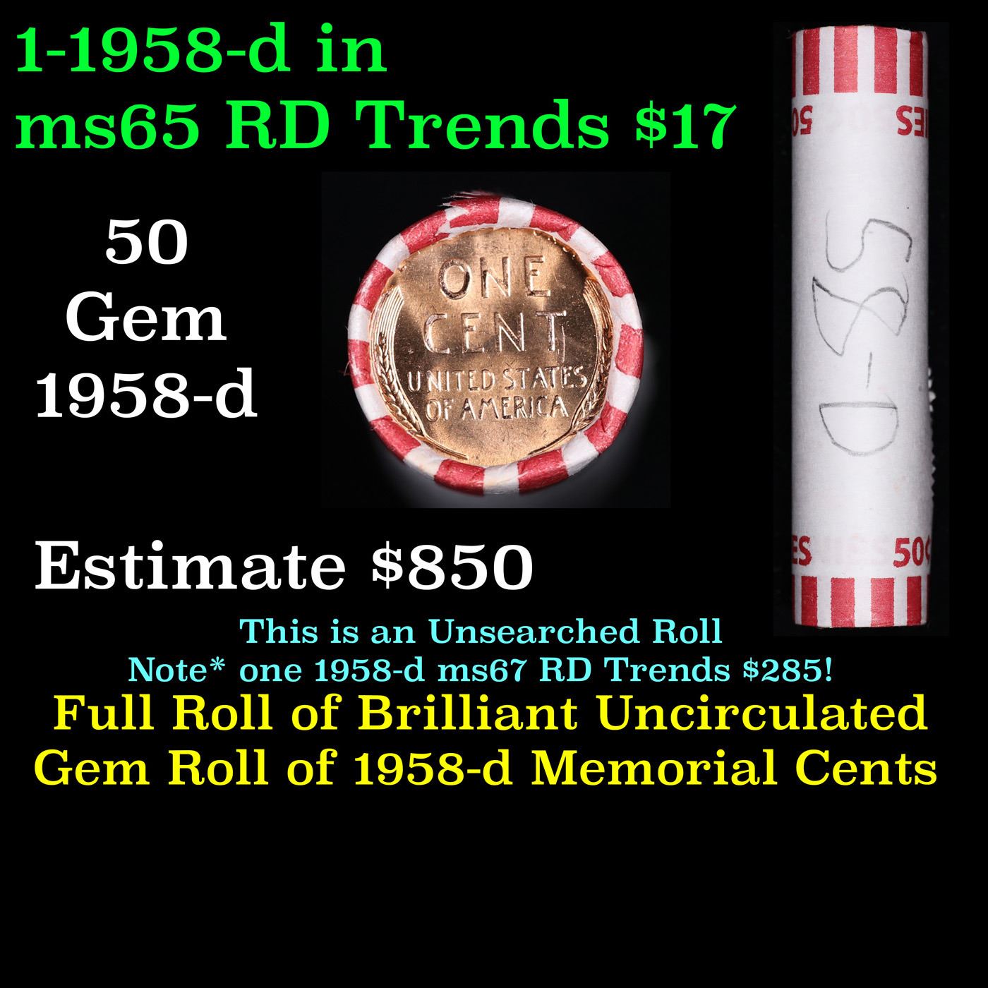 Shotgun Lincoln 1c roll, 1958-d 50 pcs Bank Wrapper.. A terrific Shotgun roll of Lincoln cents. Most if not all coin should be cherry red.