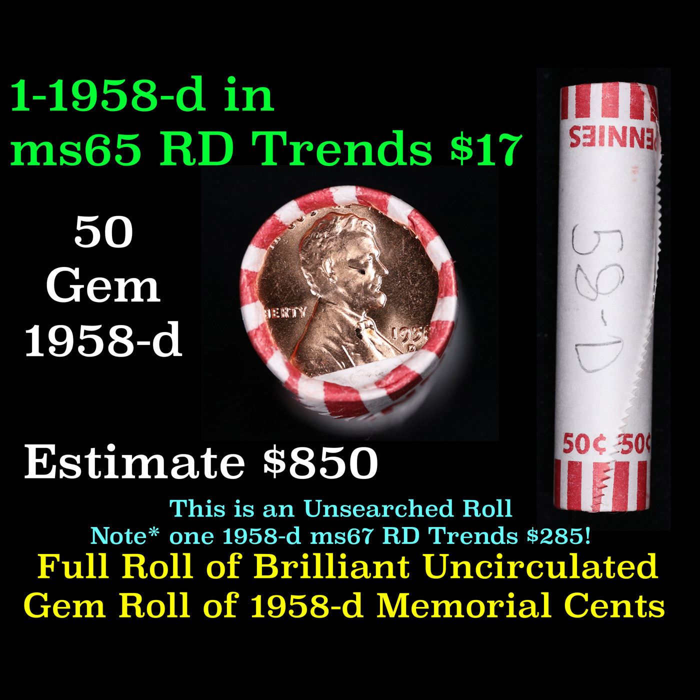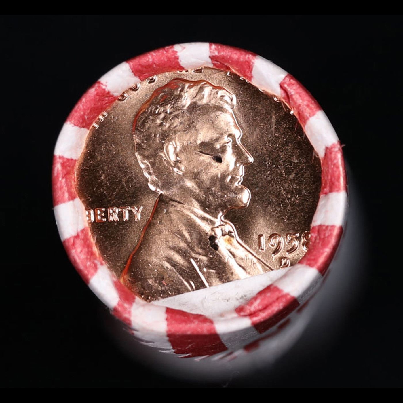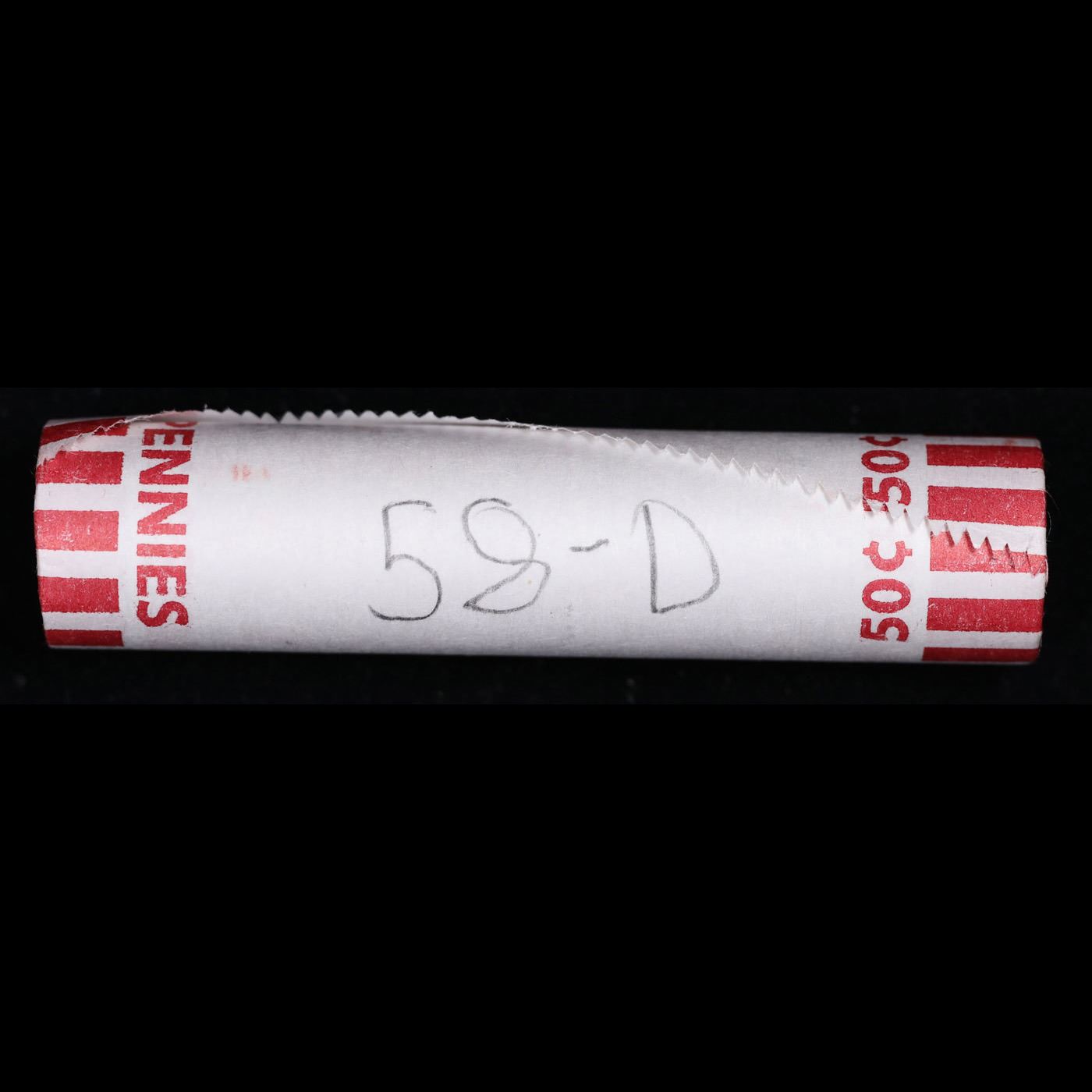 Shotgun Lincoln 1c roll, 1958-d 50 pcs Bank Wrapper.. A terrific Shotgun roll of Lincoln cents. Most if not all coin should be cherry red.