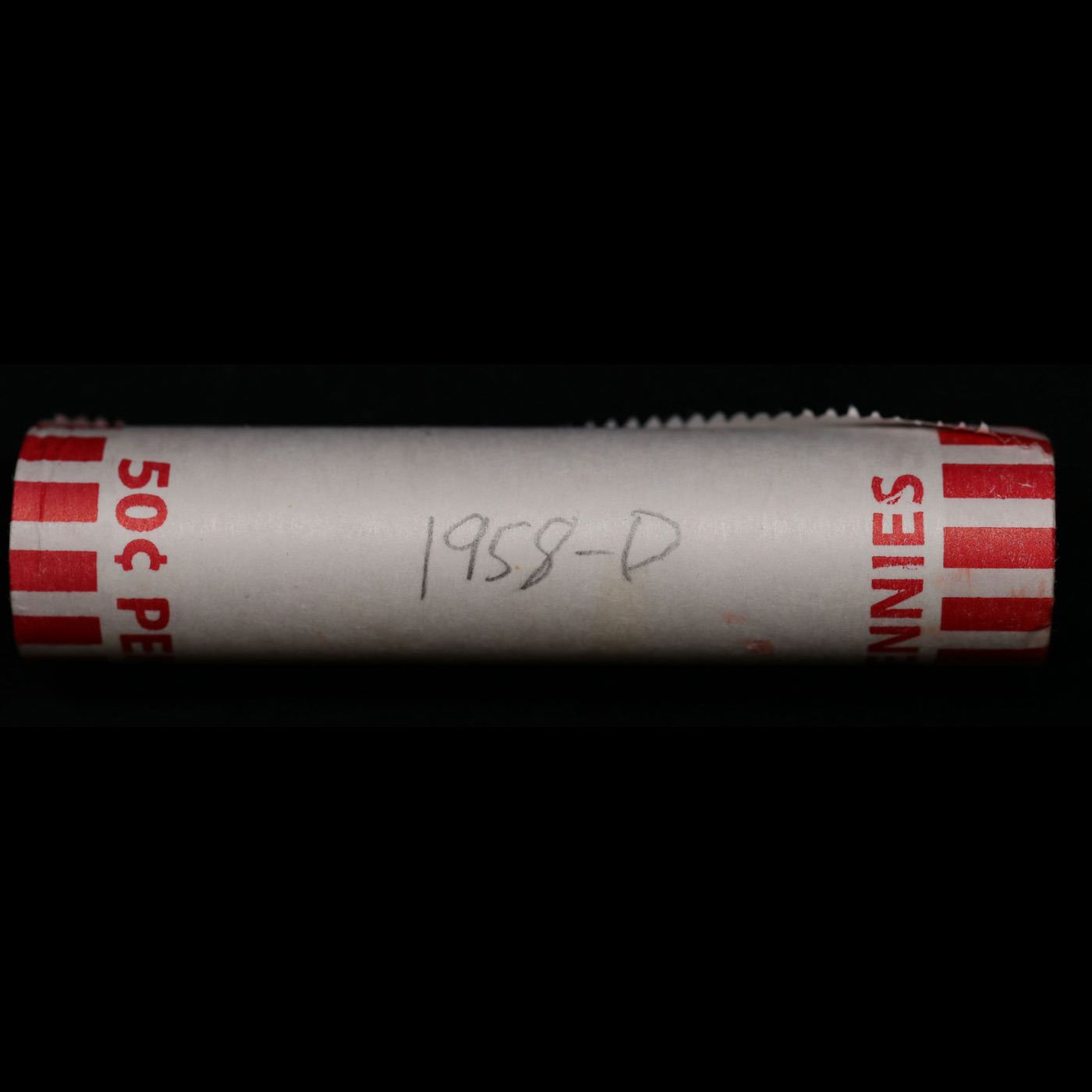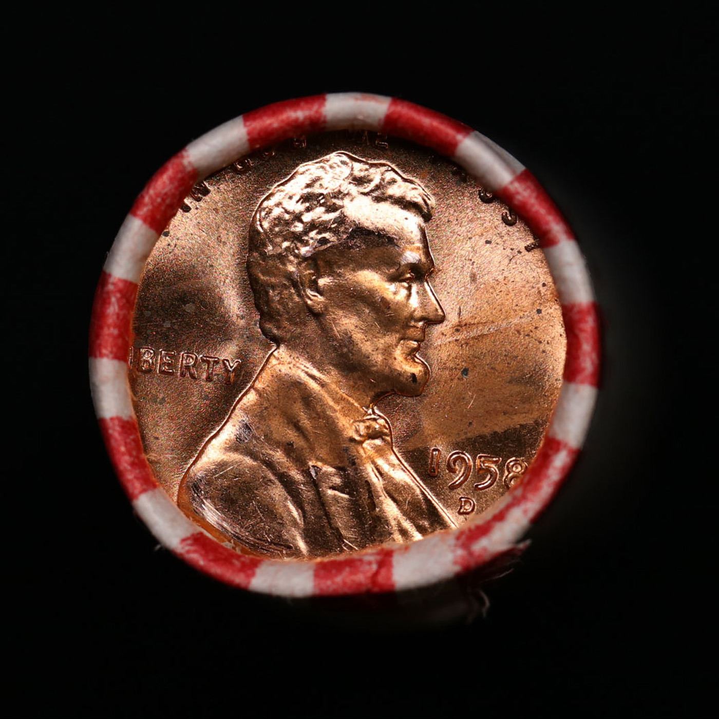 Shotgun Lincoln 1c roll, 1958-d 50 pcs Bank Wrapper.. A terrific Shotgun roll of Lincoln cents. Most if not all coin should be cherry red.