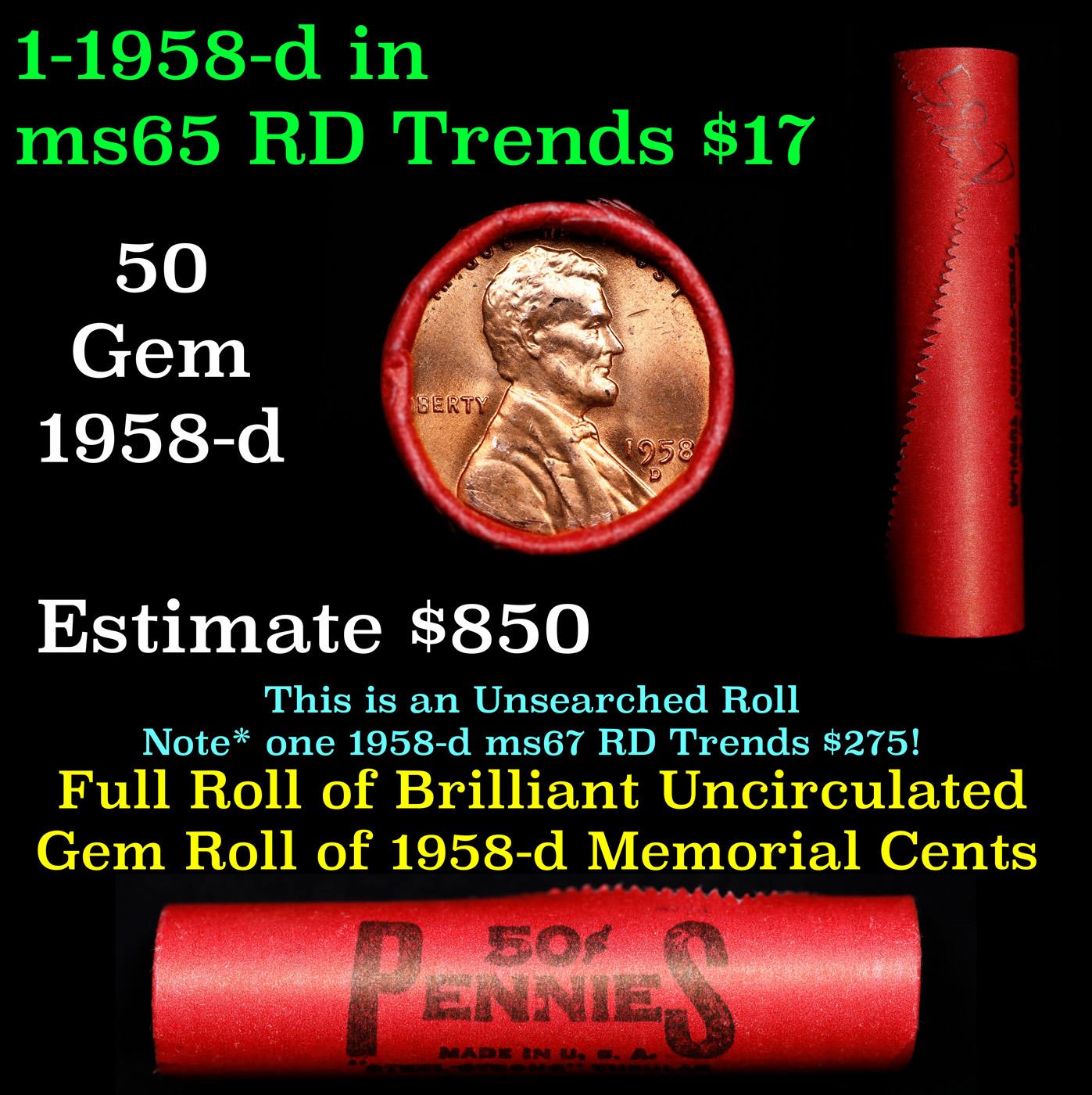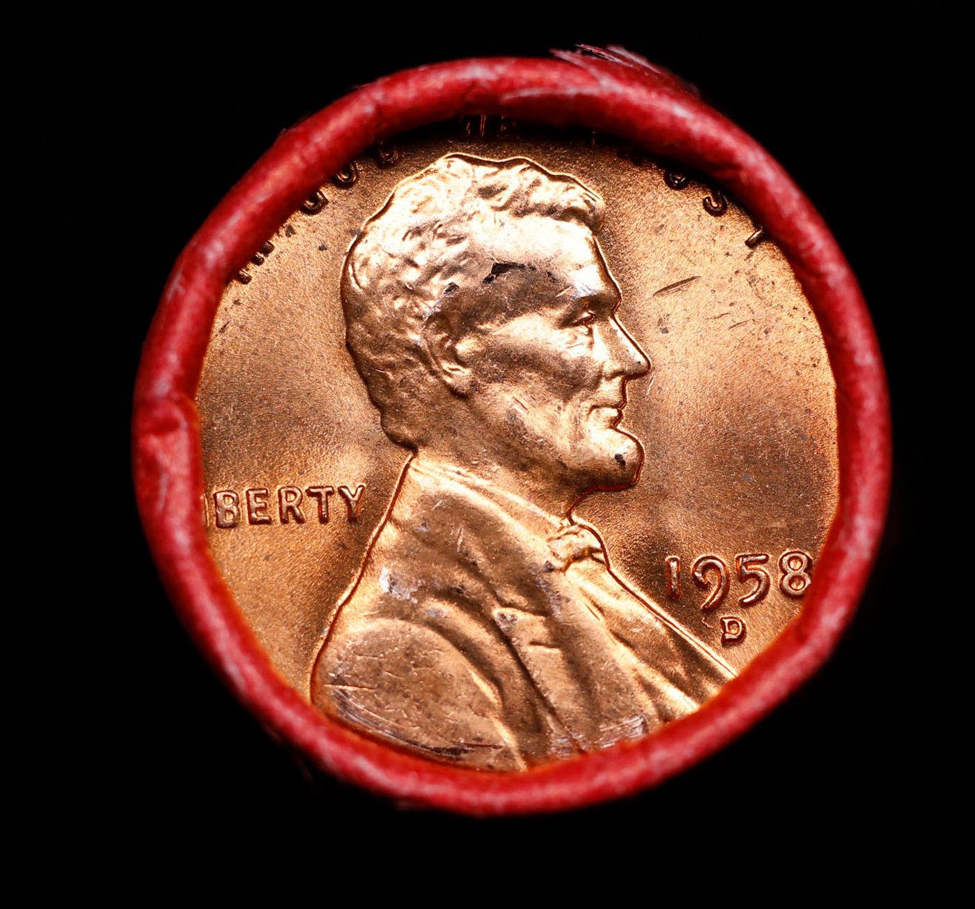 Shotgun Lincoln 1c roll, 1958-d 50 pcs Steel-Strong Wrapper.. A terrific Shotgun roll of Lincoln cents. Most if not all coin should be cherry red.