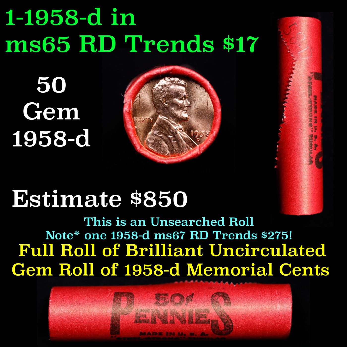 Shotgun Lincoln 1c roll, 1958-d 50 pcs Steel-Strong Wrapper.. A terrific Shotgun roll of Lincoln cents. Most if not all coin should be cherry red.
