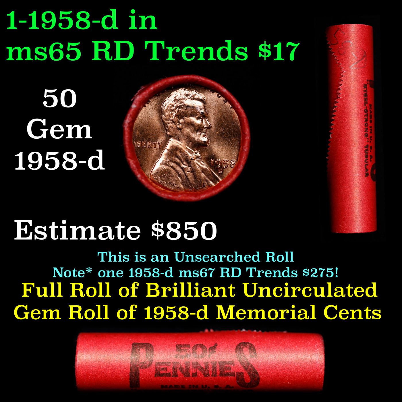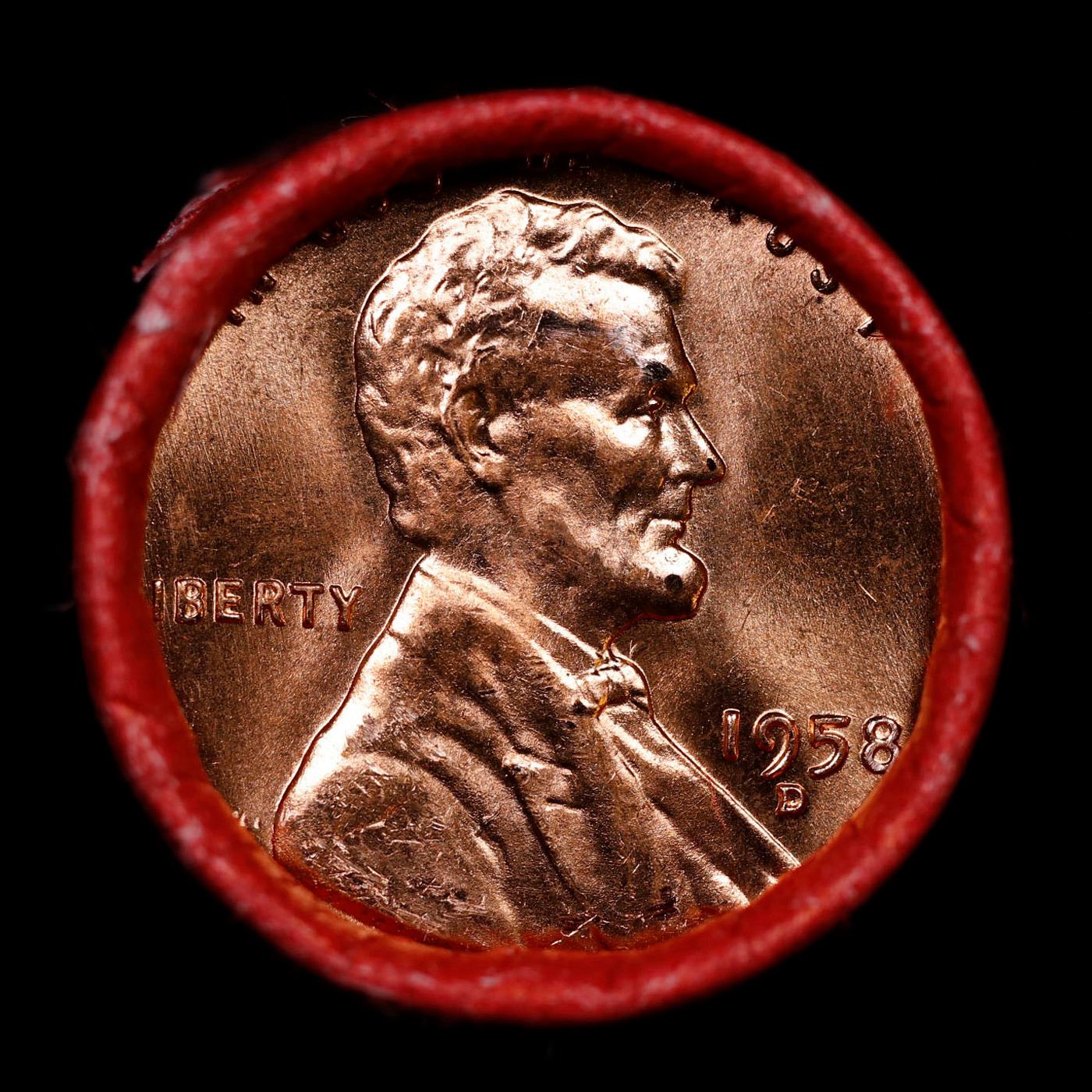 Shotgun Lincoln 1c roll, 1958-d 50 pcs Steel-Strong Wrapper.. A terrific Shotgun roll of Lincoln cents. Most if not all coin should be cherry red.