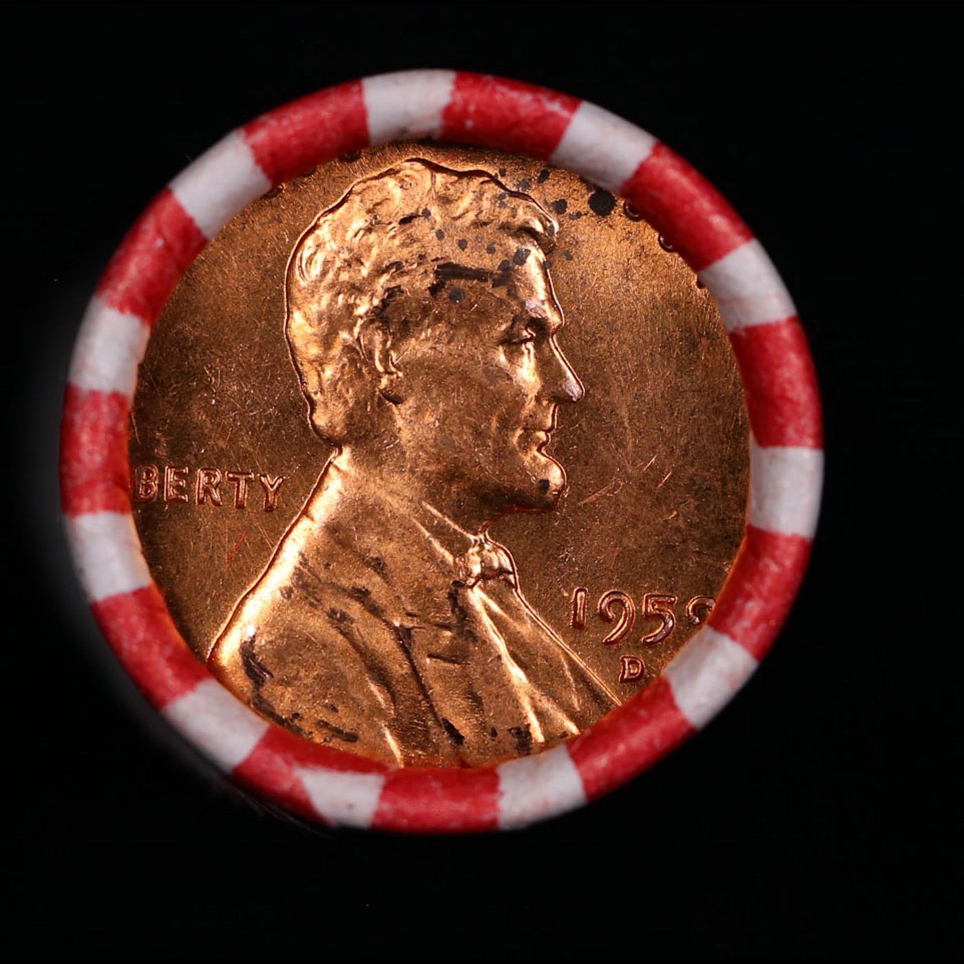 Shotgun Lincoln 1c roll, 1959-d 50 pcs Bank Wrapper.. A terrific Shotgun roll of Lincoln cents. Most if not all coin should be cherry red.