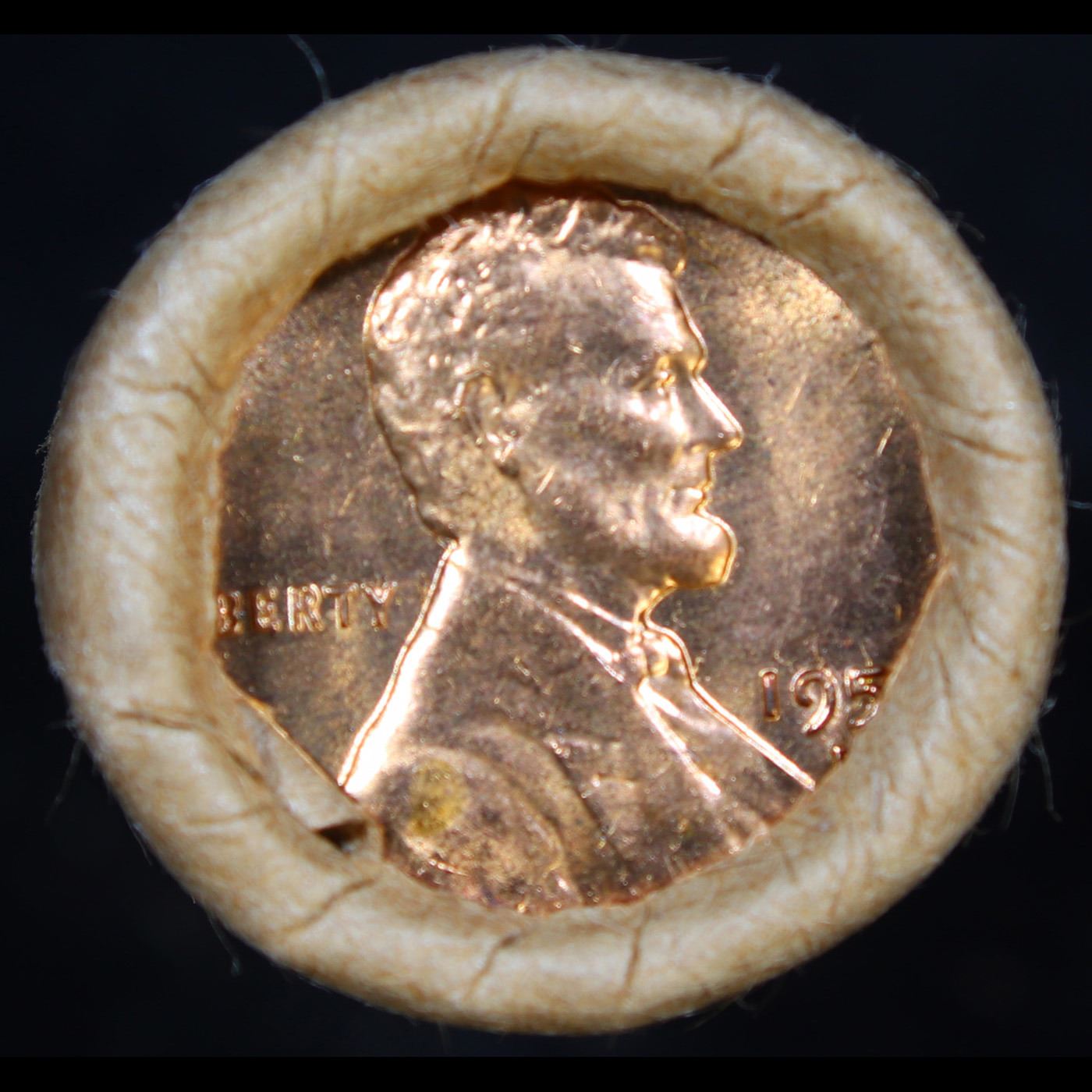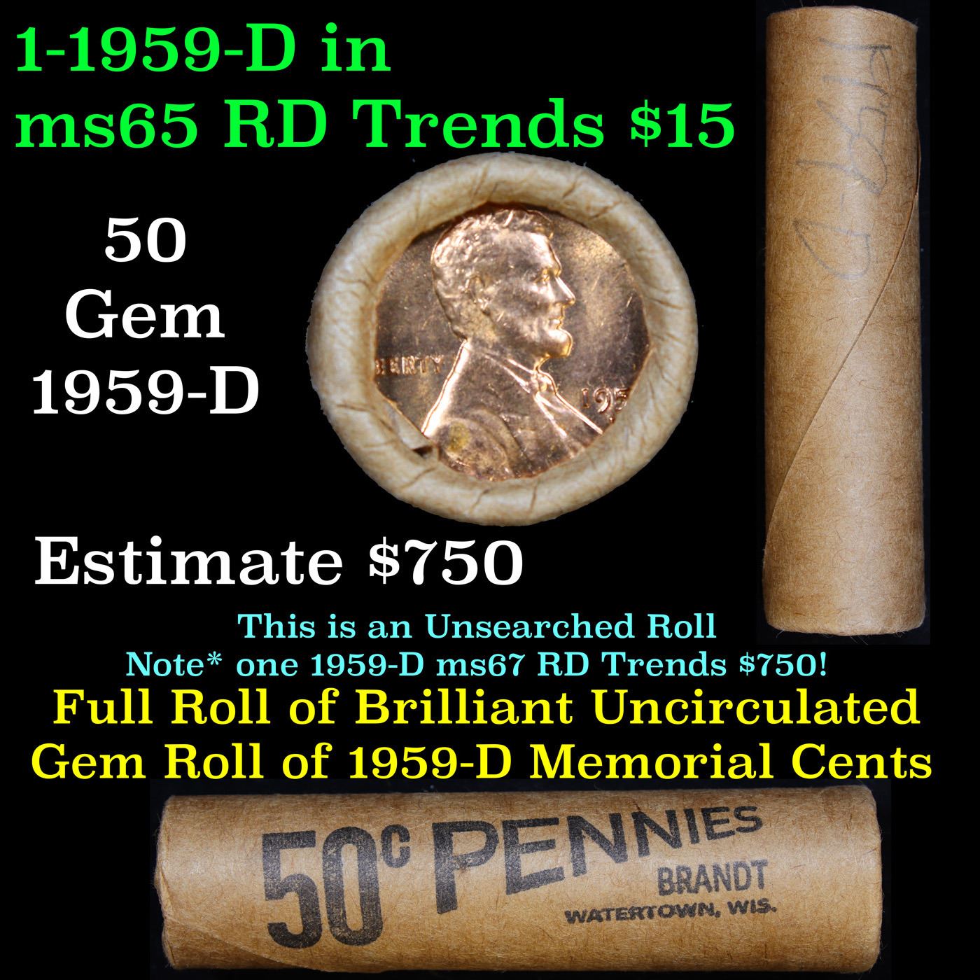 Shotgun Lincoln 1c roll, 1959-d 50 pcs Brandt Wrapper . A terrific Shotgun roll of Lincoln cents. All coins cherry red. Trends ms65 rd