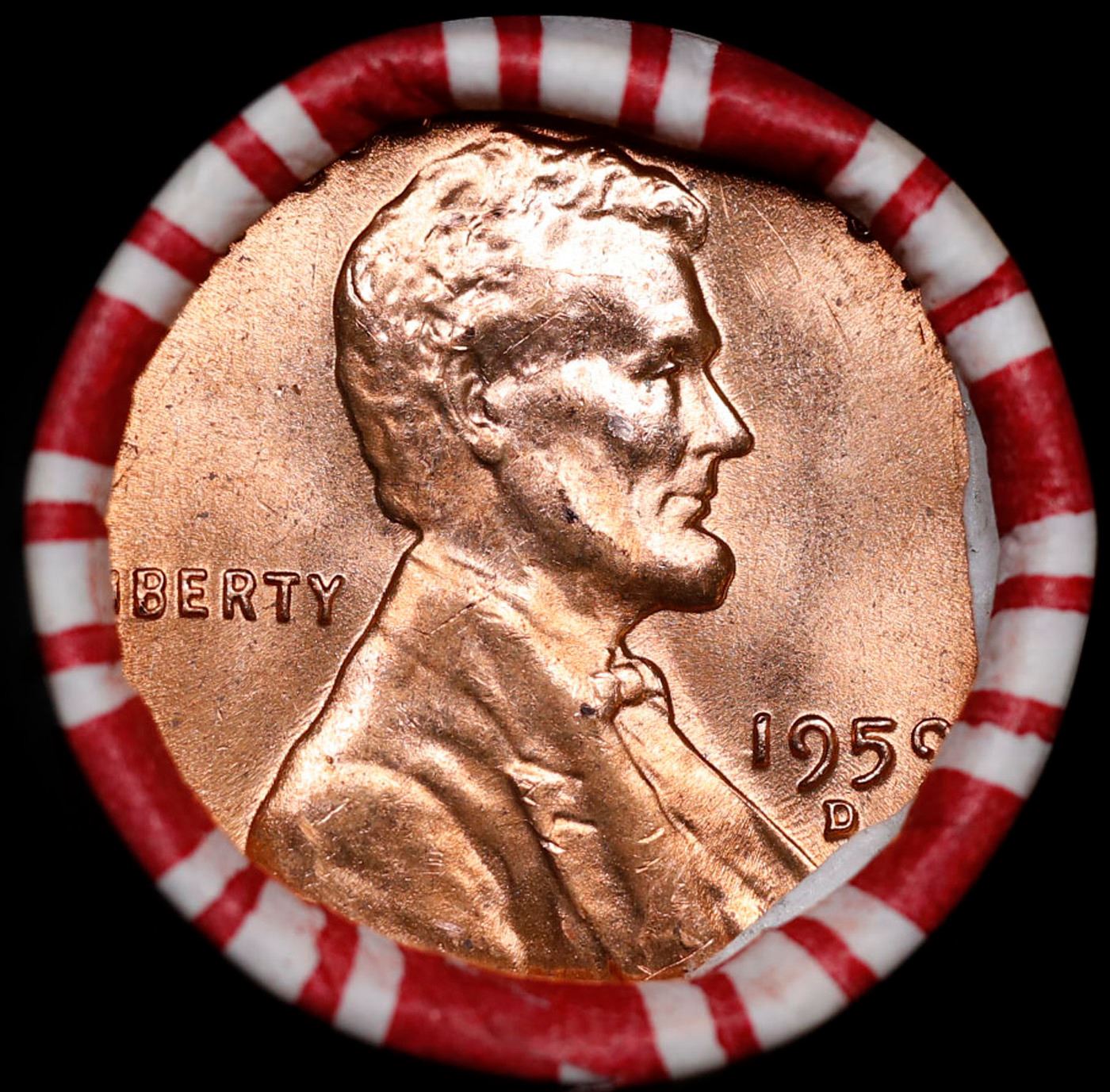 Shotgun Lincoln 1c roll, 1959-d 50 pcs Original Bank Wrapper.. A terrific Shotgun roll of Lincoln cents. Most if not all coin should be cherry red.