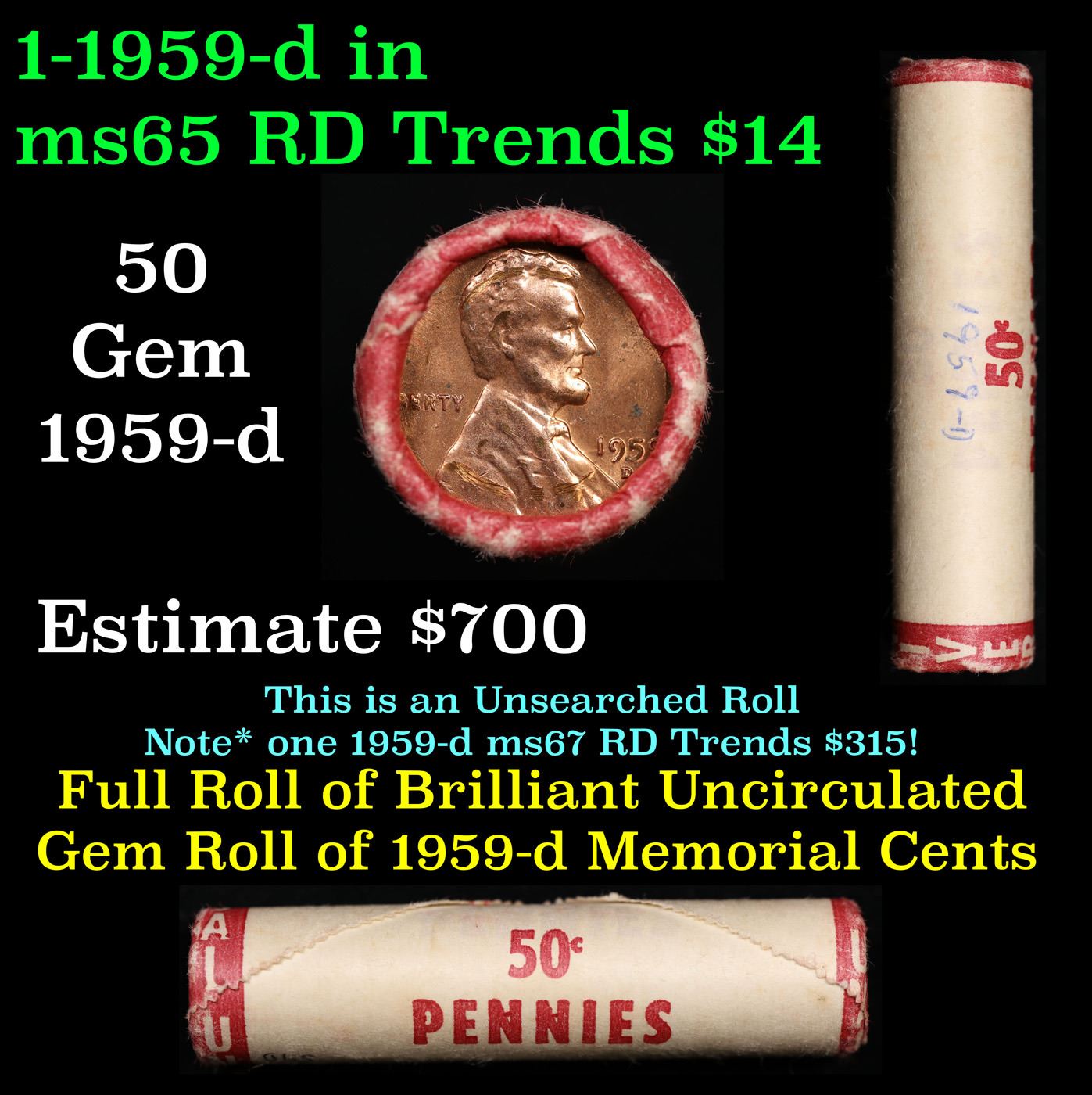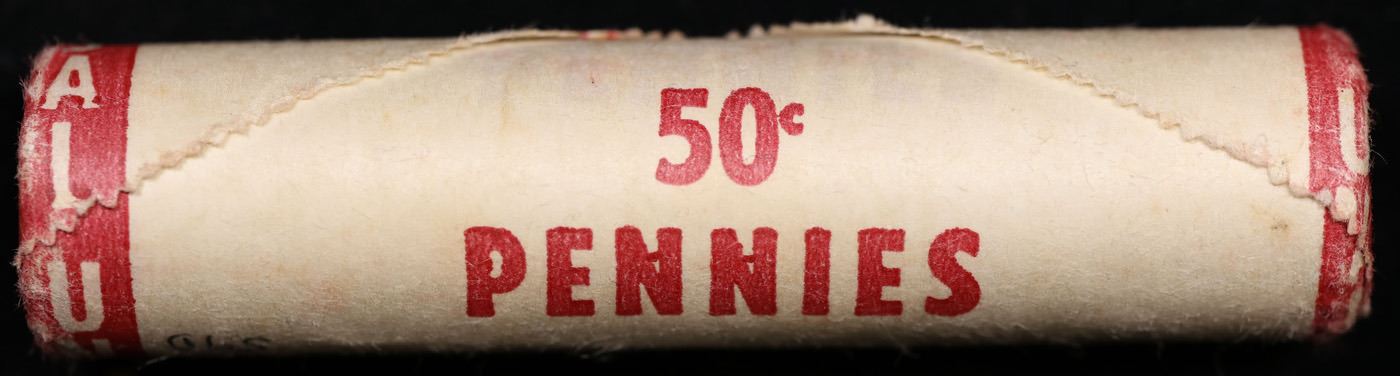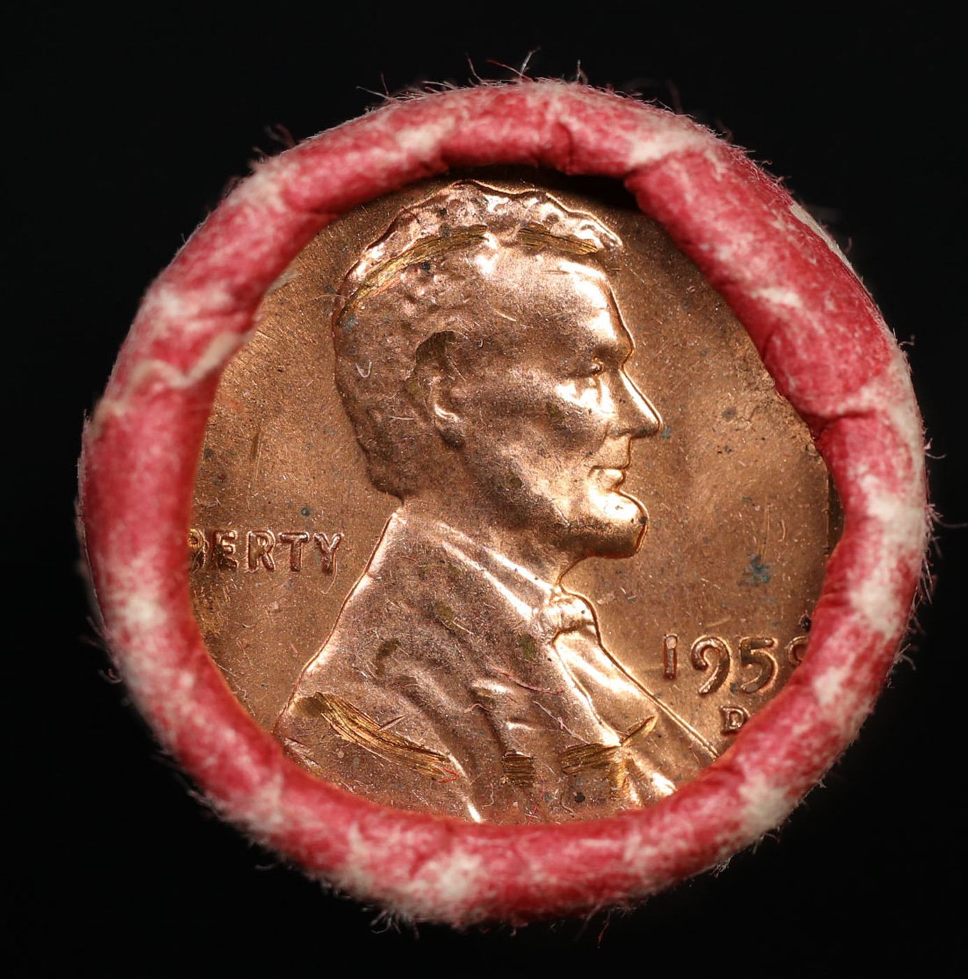 Shotgun Lincoln 1c roll, 1959-d 50 pcs Wrapper.. A terrific Shotgun roll of Lincoln cents. All coins appear to be cherry red. Trends ms65 rd $18