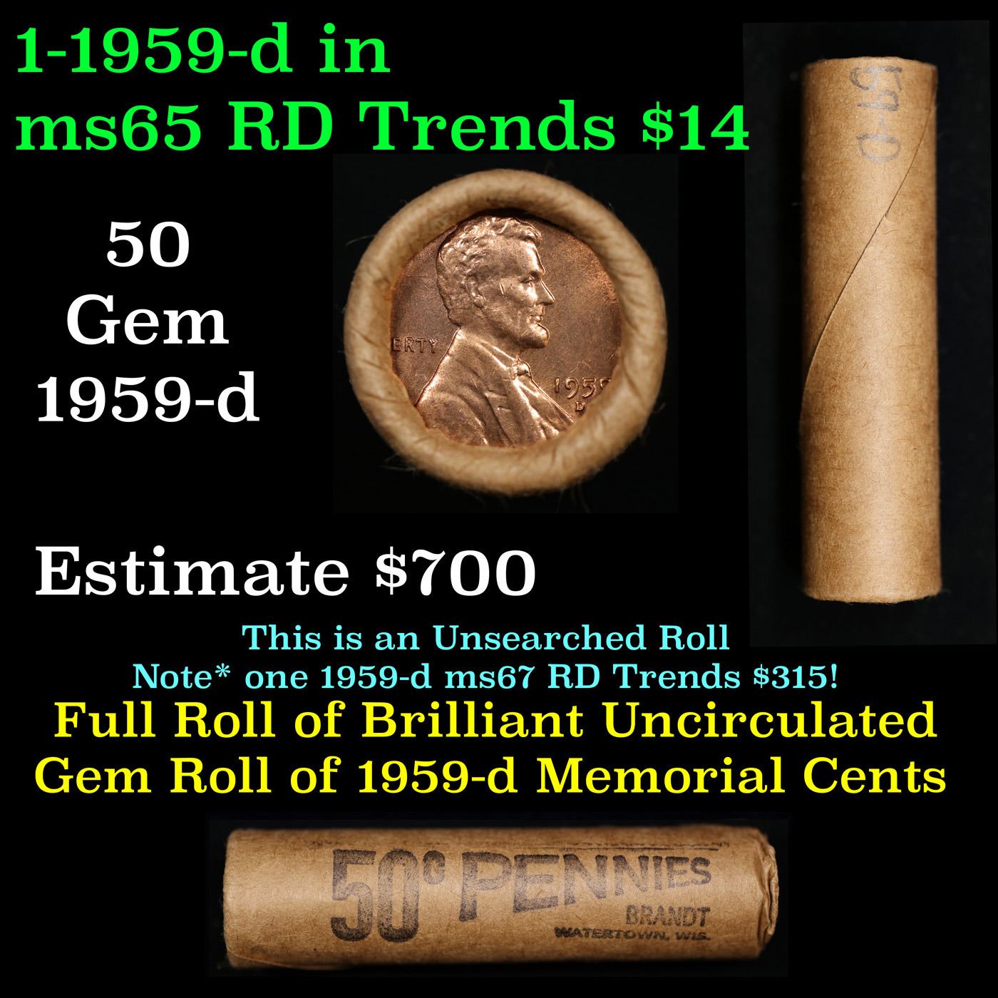 Shotgun Lincoln 1c roll, 1959-d 50 pcs Wrapper.. A terrific Shotgun roll of Lincoln cents. Most if not all coin should be cherry red. Trends ms65 rd $14