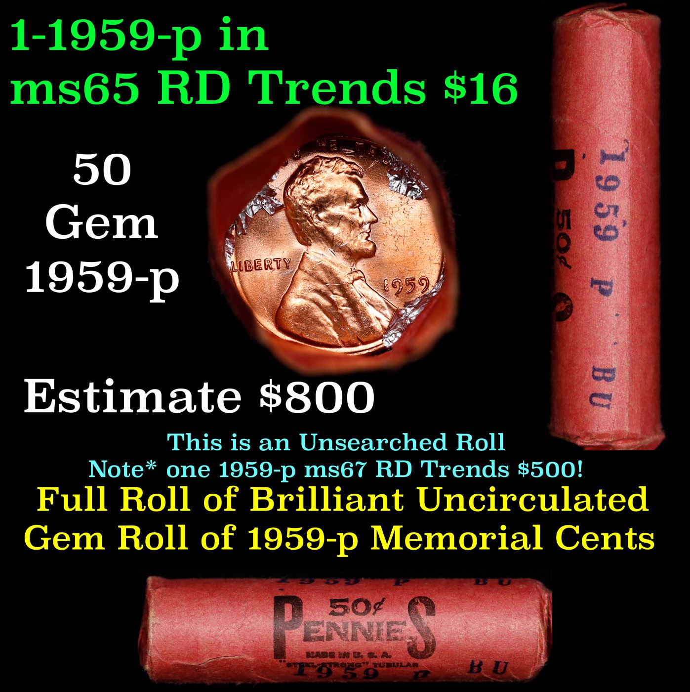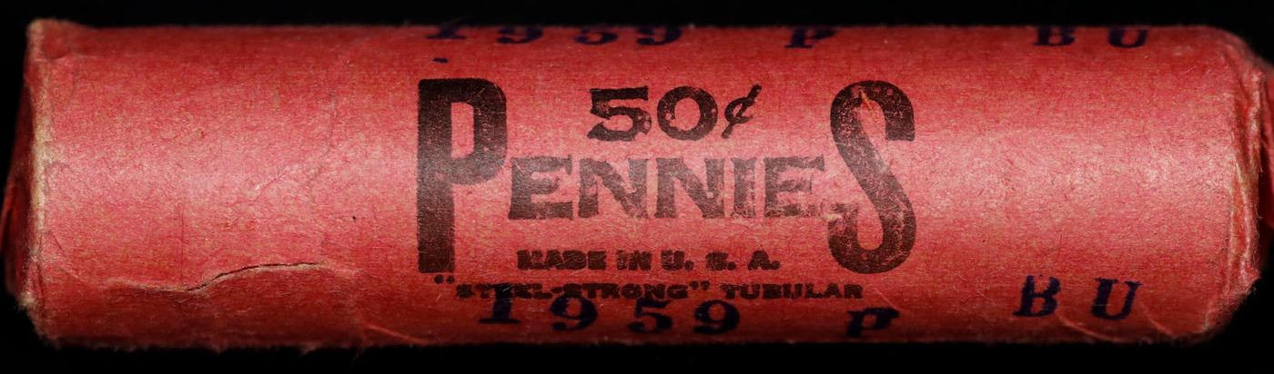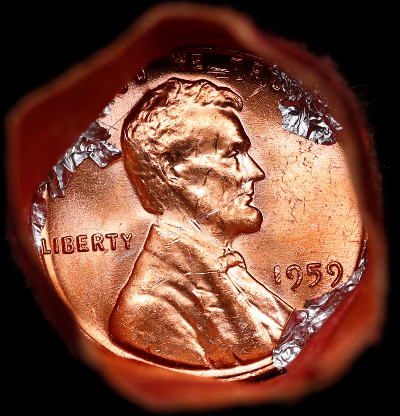 Shotgun Lincoln 1c roll, 1959-dp 50 pcs Steel Strong Wrapper.. The roll is held in an old Rare & Collectable Brinks 'Only Brinks Can Open This Safe, Chicago IL' Penny wrapper. Actual roll pictured is the roll you will get. A great original bank shotgun roll with very tight ends. We have opened a few of these rolls. They seem to be mixed small cents including Indians, Wheats, Steel cents & some Flying Eagles mixed in. These shotgun rolls are all from a new consignee. They are all frrom one Estate.