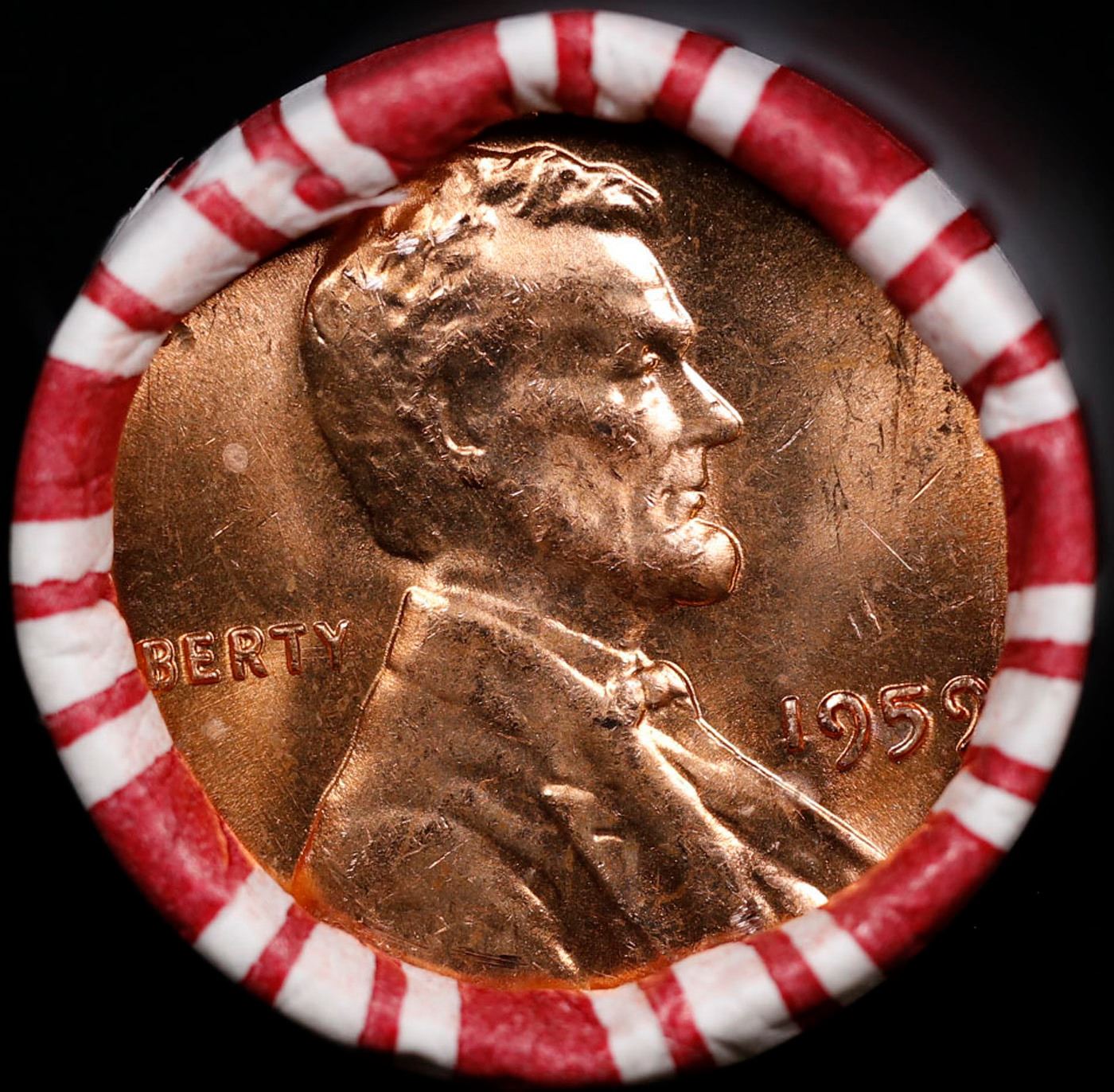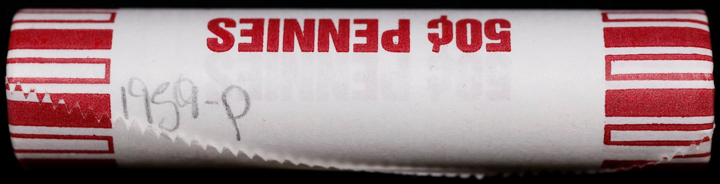 Shotgun Lincoln 1c roll, 1959-p 50 pcs Bank 50c Wrapper.. A terrific Shotgun roll of Lincoln cents. Most if not all coin should be cherry red.