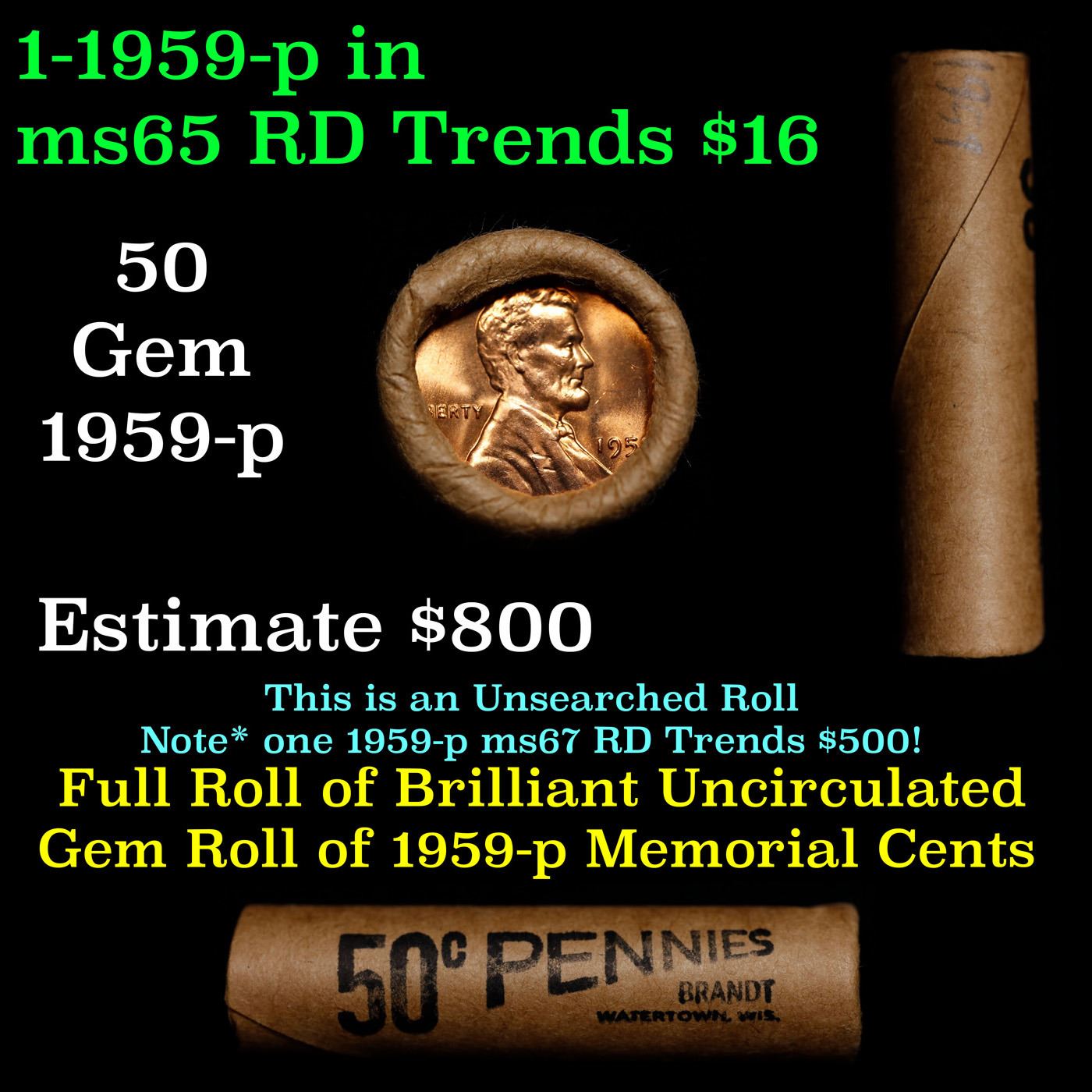 Shotgun Lincoln 1c roll, 1959-p 50 pcs Brandt Wrapper.. A terrific Shotgun roll of Lincoln cents. Most if not all coin should be cherry red. Trends ms65 rd $12