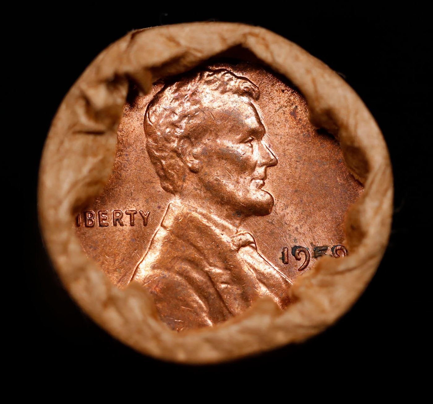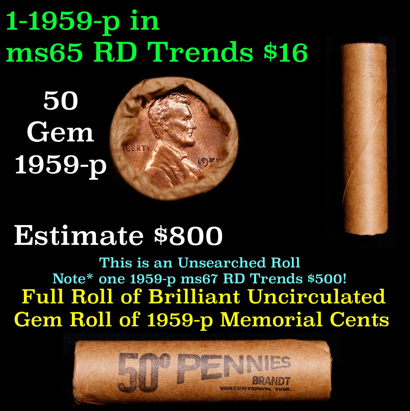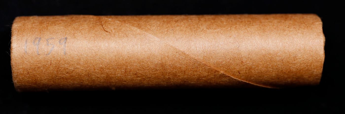 Shotgun Lincoln 1c roll, 1959-p 50 pcs Brandt Wrapper.. A terrific Shotgun roll of Lincoln cents. Most if not all coin should be cherry red.
