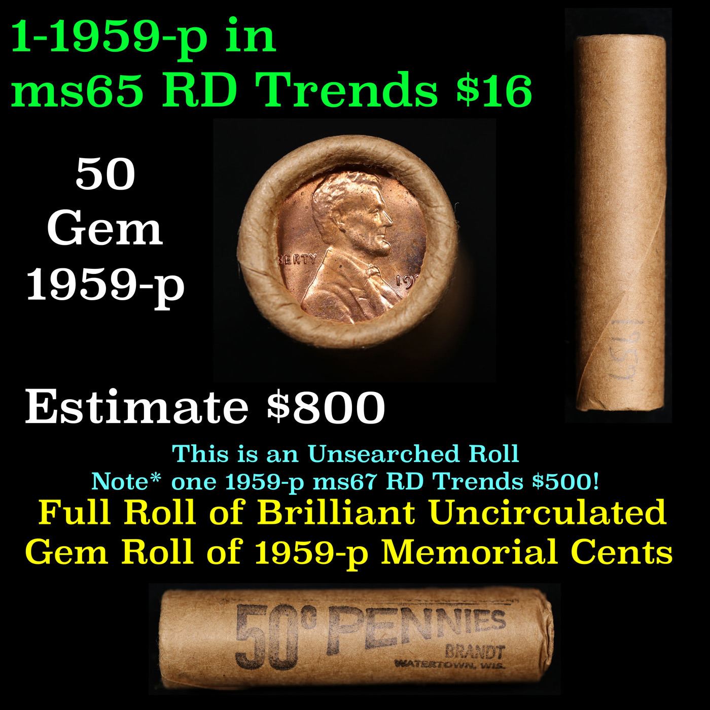 Shotgun Lincoln 1c roll, 1959-p 50 pcs Provident Tradesman Wrapper .