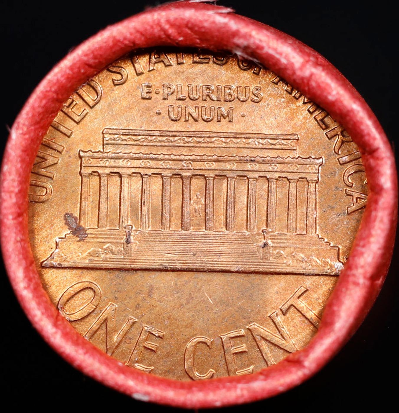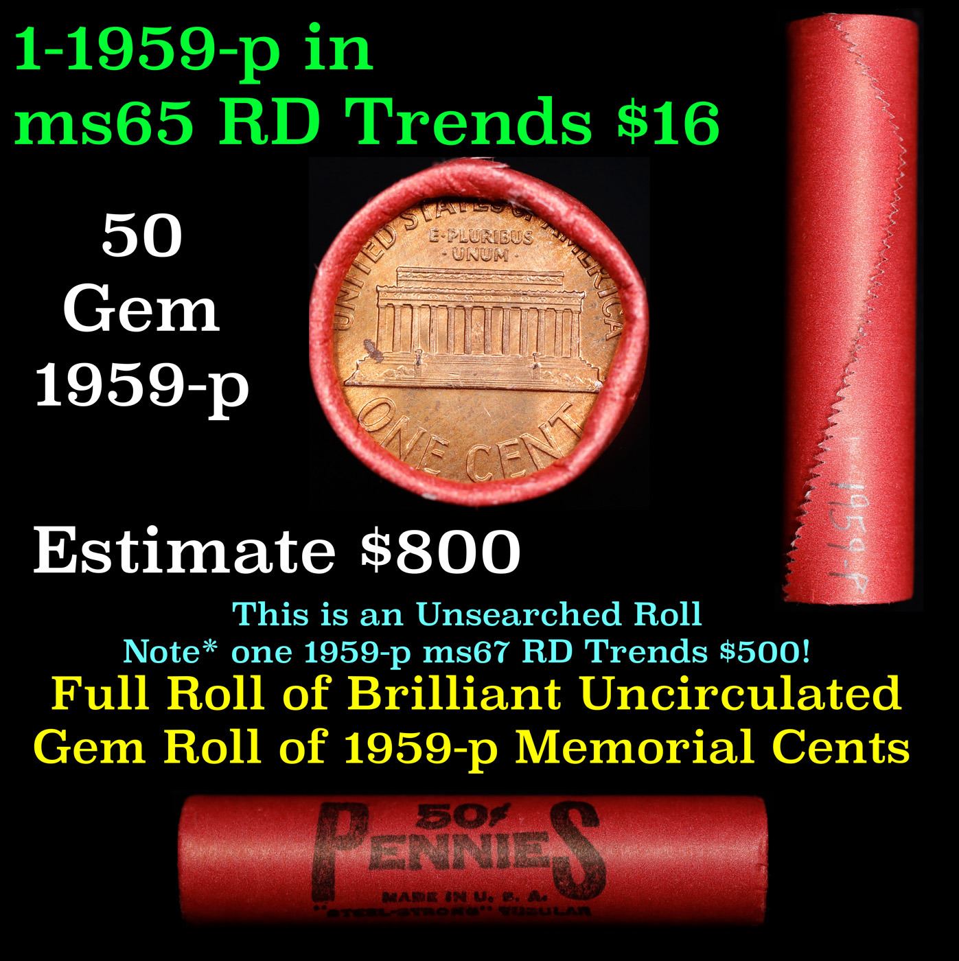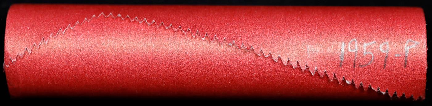 Shotgun Lincoln 1c roll, 1959-p 50 pcs Steel-Strong 50c Wrapper.. A terrific Shotgun roll of Lincoln cents. Most if not all coin should be cherry red.