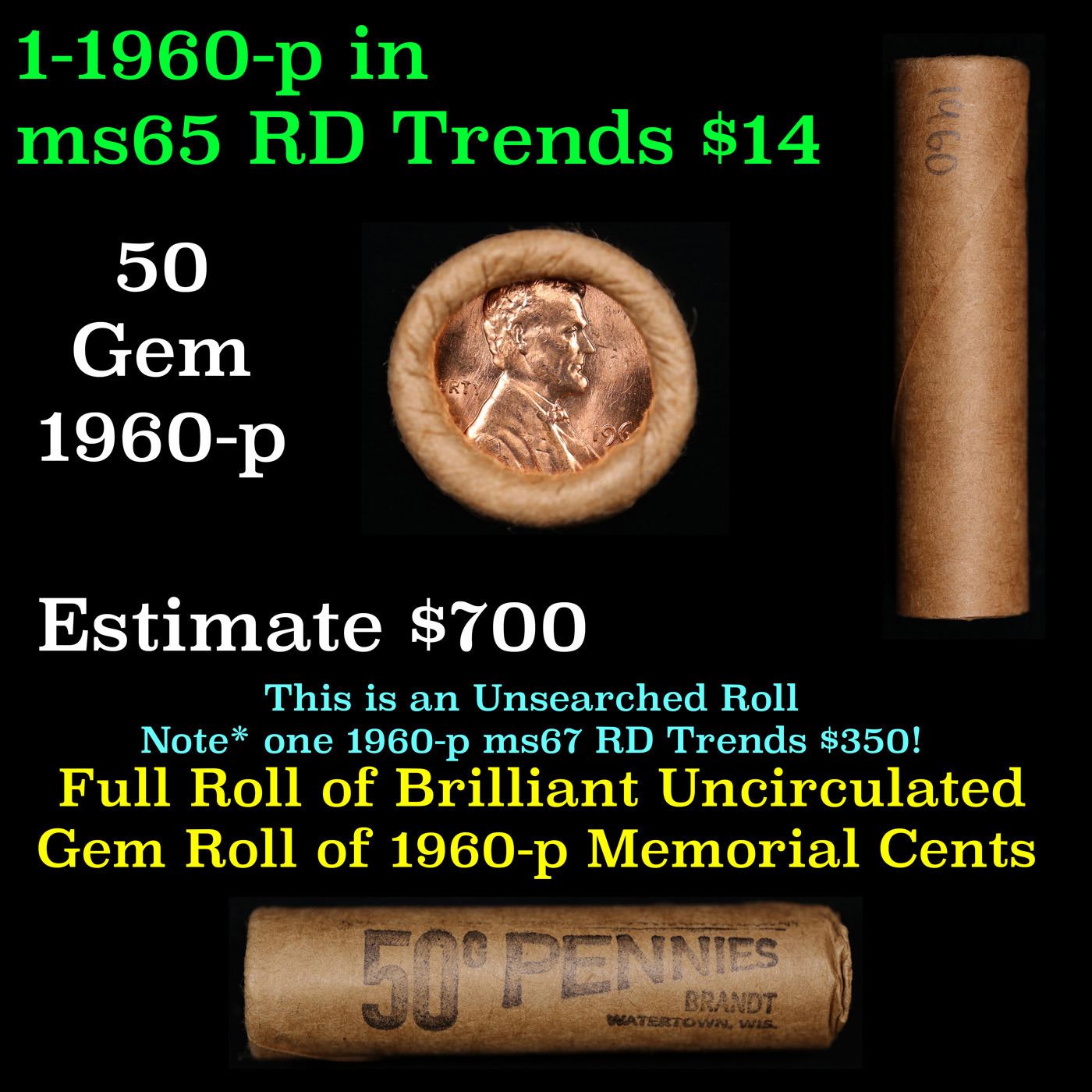 Shotgun Lincoln 1c roll, 1960-P 50 pcs Brandt Wrapper.. A terrific Shotgun roll of Lincoln cents. Most if not all coin should be cherry red.
