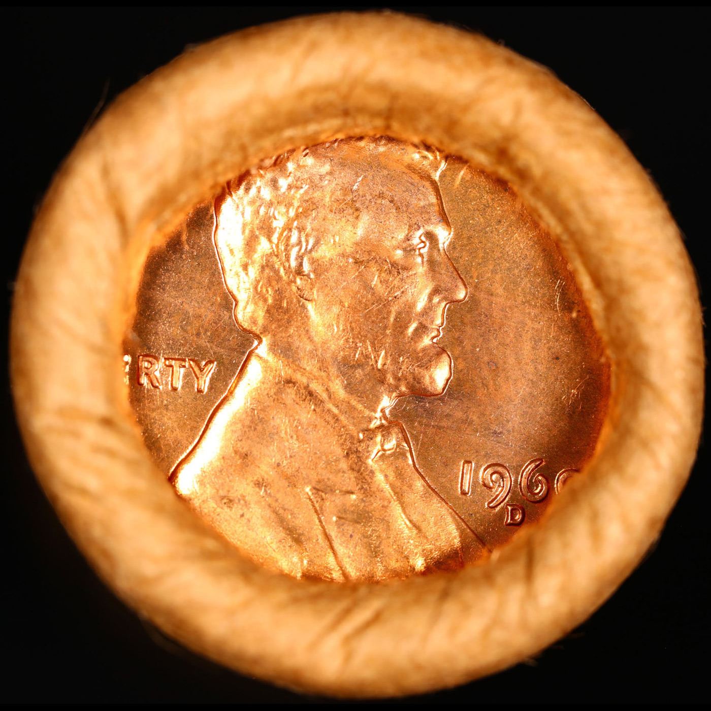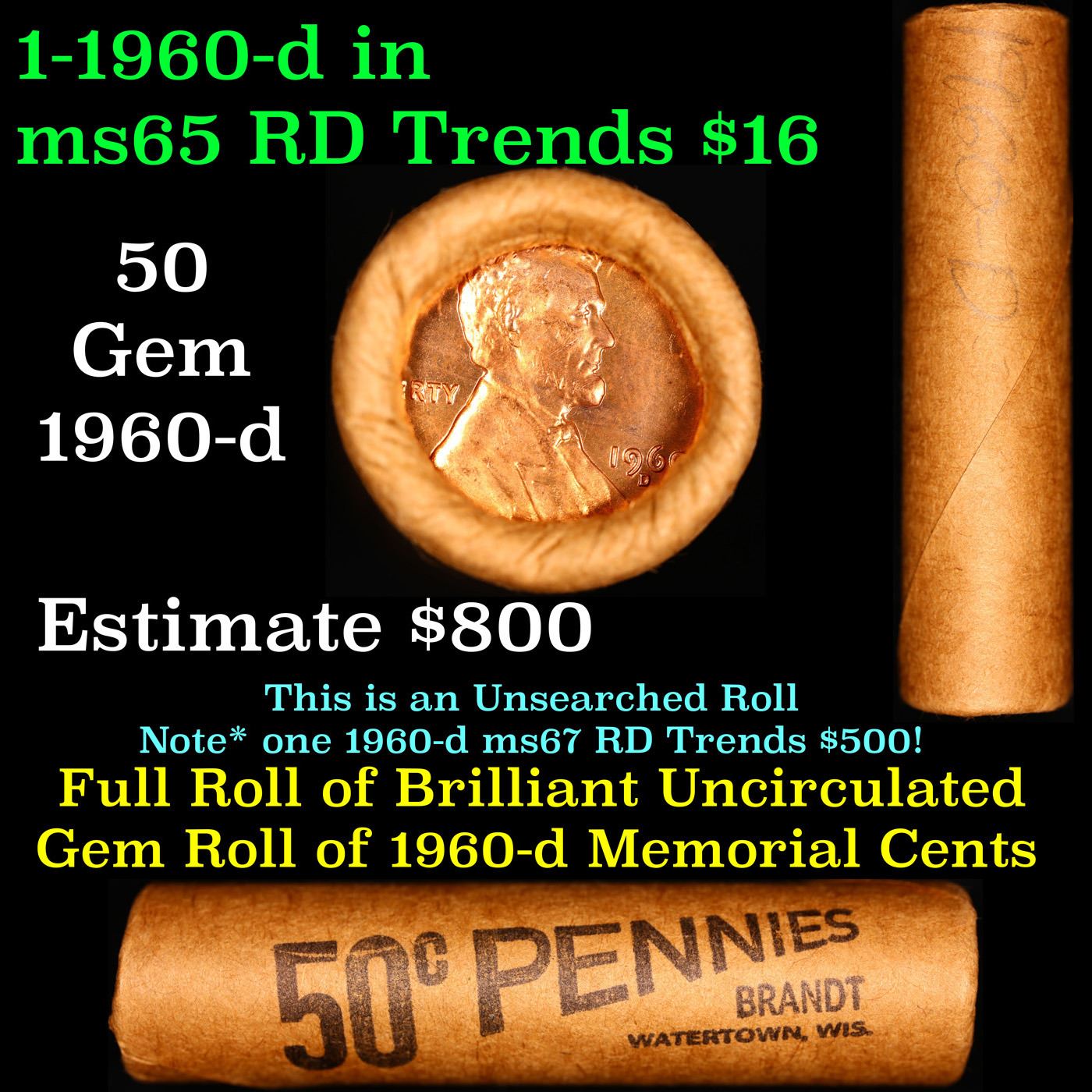 Shotgun Lincoln 1c roll, 1960-d 50 pcs Brandt Wrapper . A terrific Shotgun roll of Lincoln cents. All coins cherry red. Trends ms65 rd $16