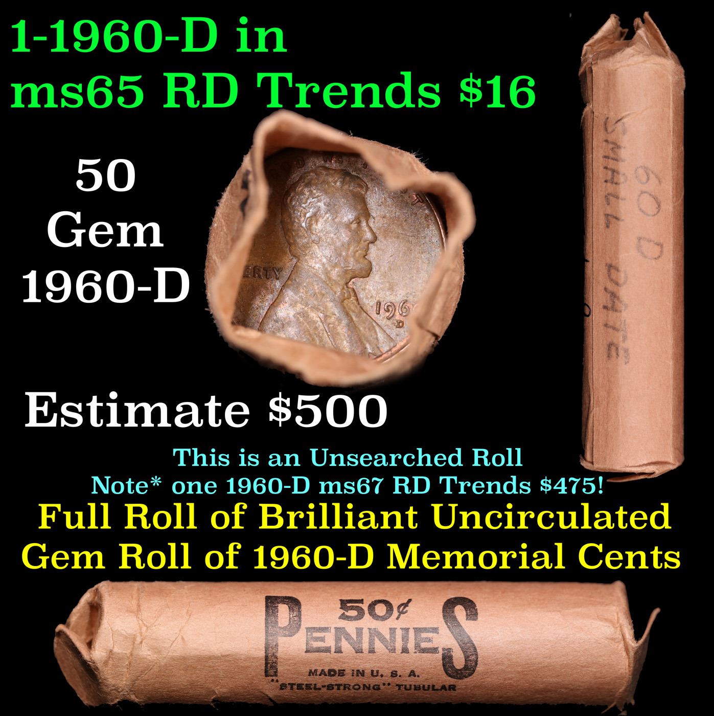 Shotgun Lincoln 1c roll, 1960-d 50 pcs Steel-Strong Wrapper . A terrific Shotgun roll of Lincoln cents. All coins cherry red. Trends ms65 rd $16