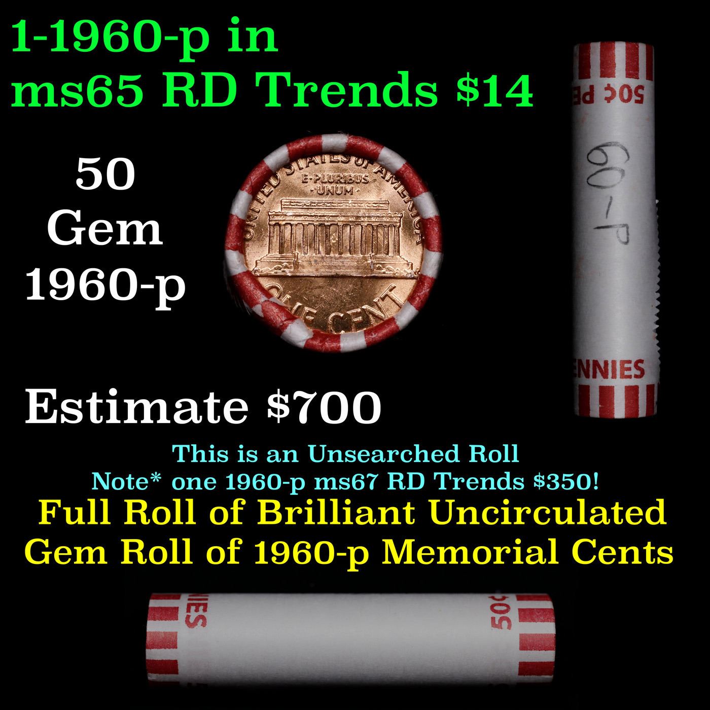 Shotgun Lincoln 1c roll, 1960-p 50 pcs Bank Wrapper.. A terrific Shotgun roll of Lincoln cents. Most if not all coin should be cherry red.