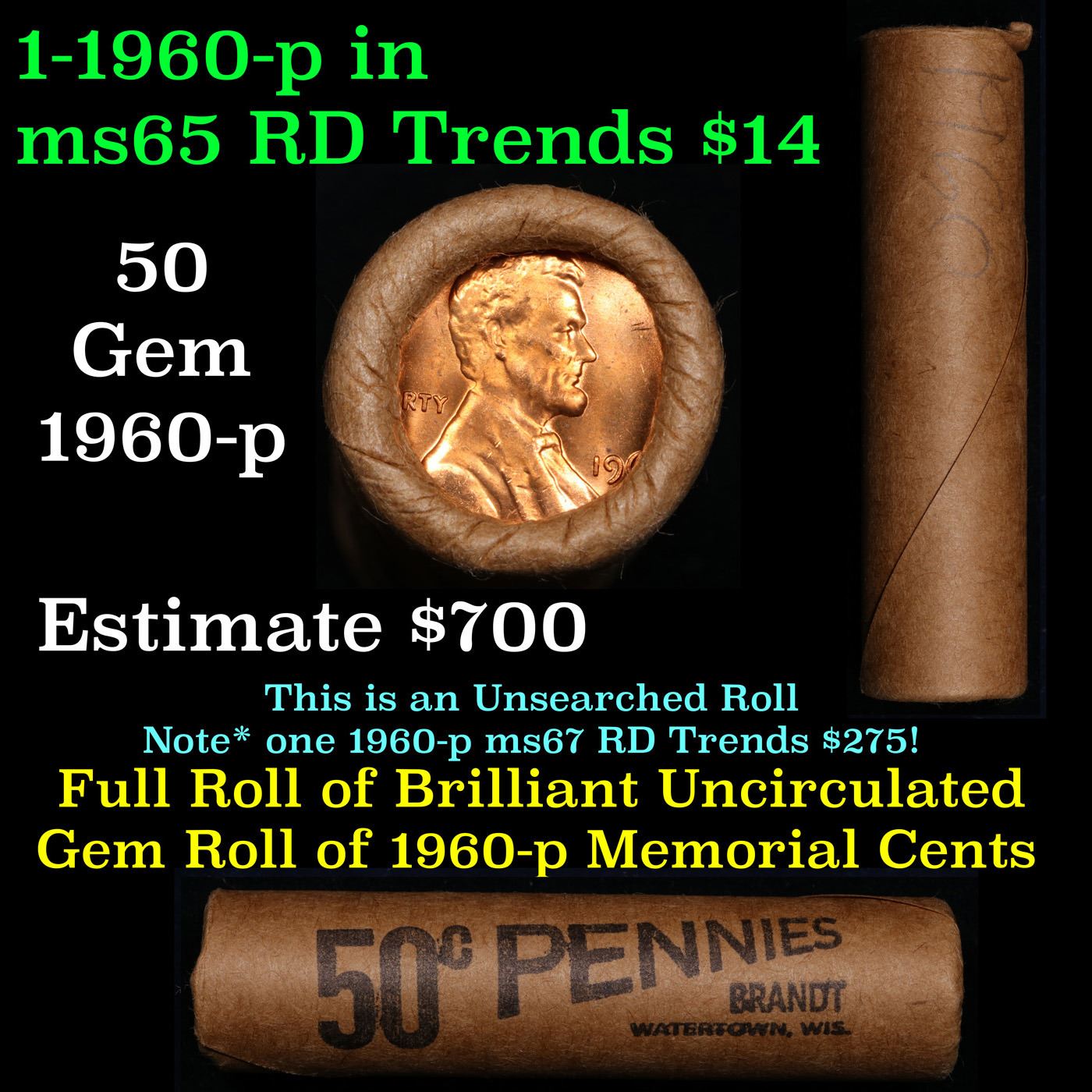 Shotgun Lincoln 1c roll, 1960-p 50 pcs Brandt Wrapper .