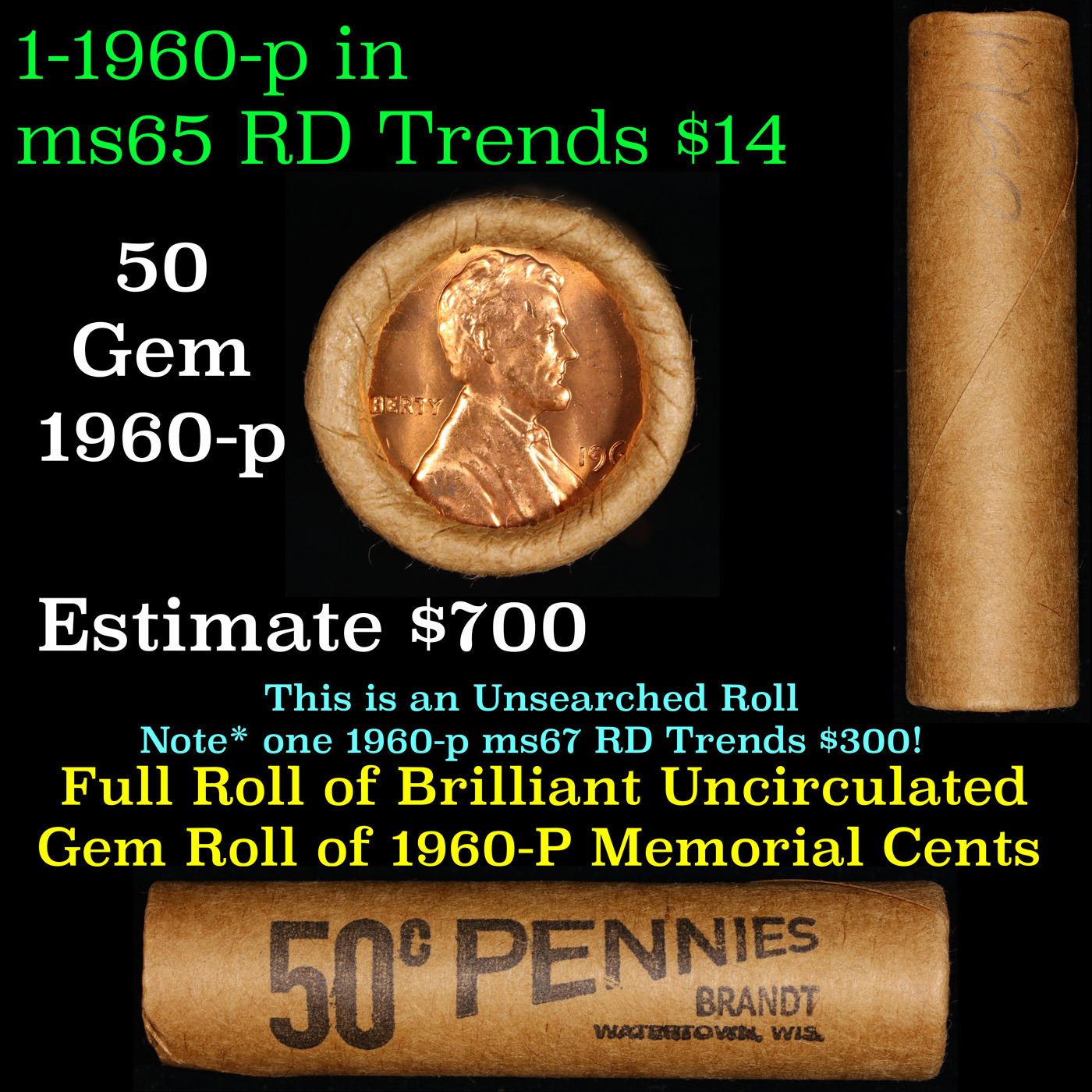 Shotgun Lincoln 1c roll, 1960-p 50 pcs Brandt Wrapper . A terrific Shotgun roll of Lincoln cents. All coins cherry red. Trends ms65 rd $14