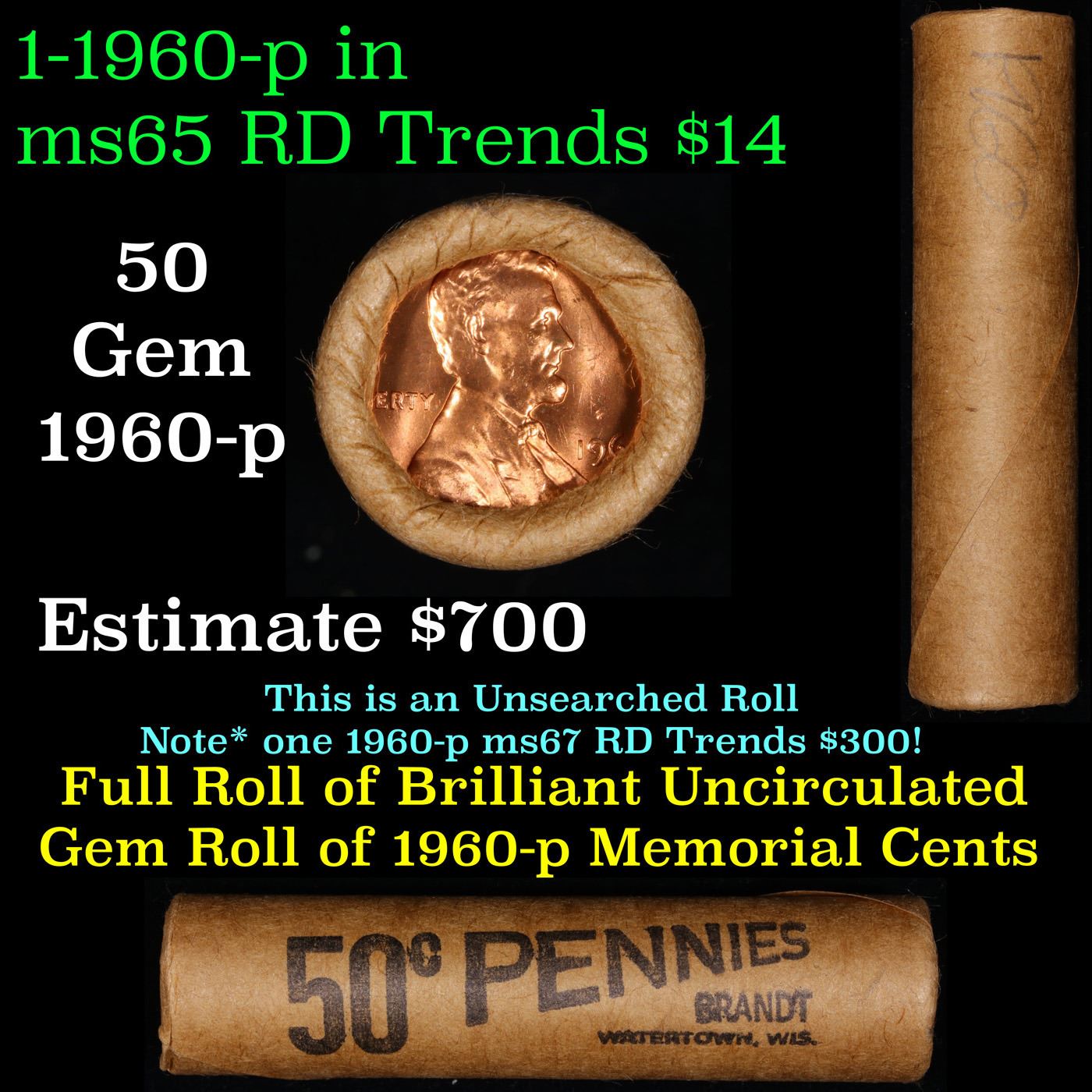 Shotgun Lincoln 1c roll, 1960-p 50 pcs Brandt Wrapper . A terrific Shotgun roll of Lincoln cents. All coins cherry red. Trends ms65 rd $14