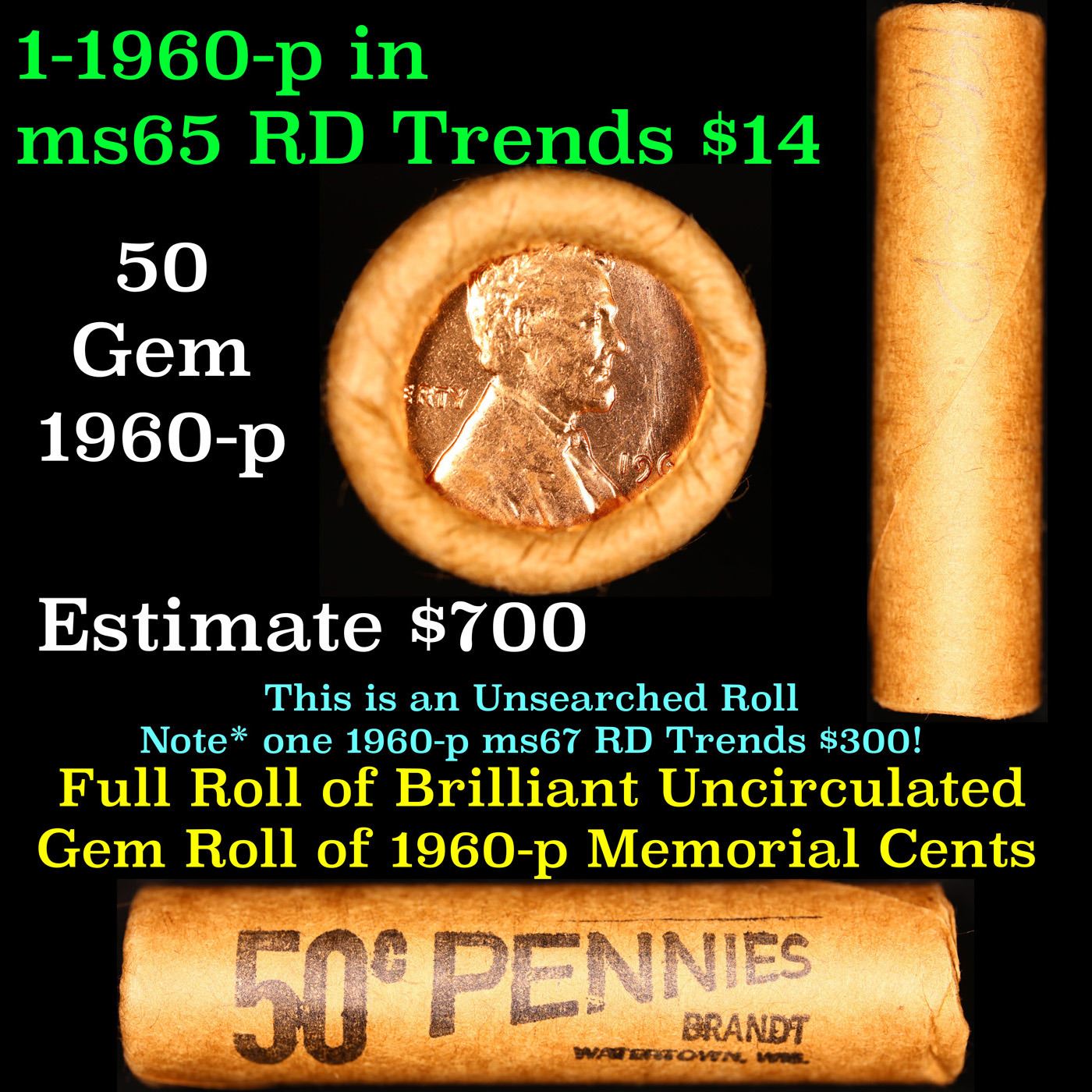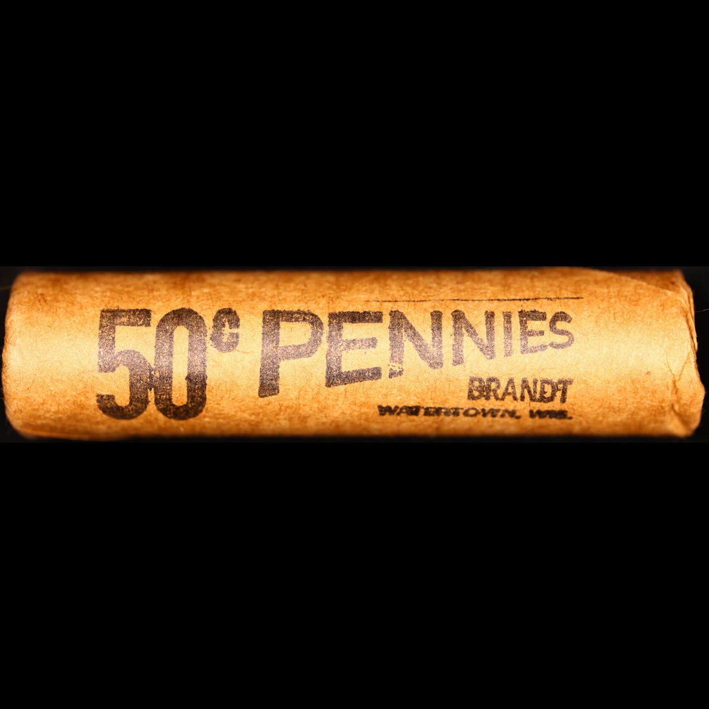 Shotgun Lincoln 1c roll, 1960-p 50 pcs Brandt Wrapper . A terrific Shotgun roll of Lincoln cents. All coins cherry red. Trends ms65 rd $14