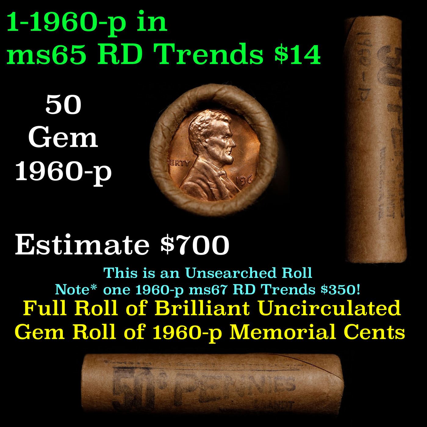 Shotgun Lincoln 1c roll, 1960-p 50 pcs Brandt Wrapper.. A terrific Shotgun roll of Lincoln cents. Most if not all coin should be cherry red. Trends ms65 rd $14
