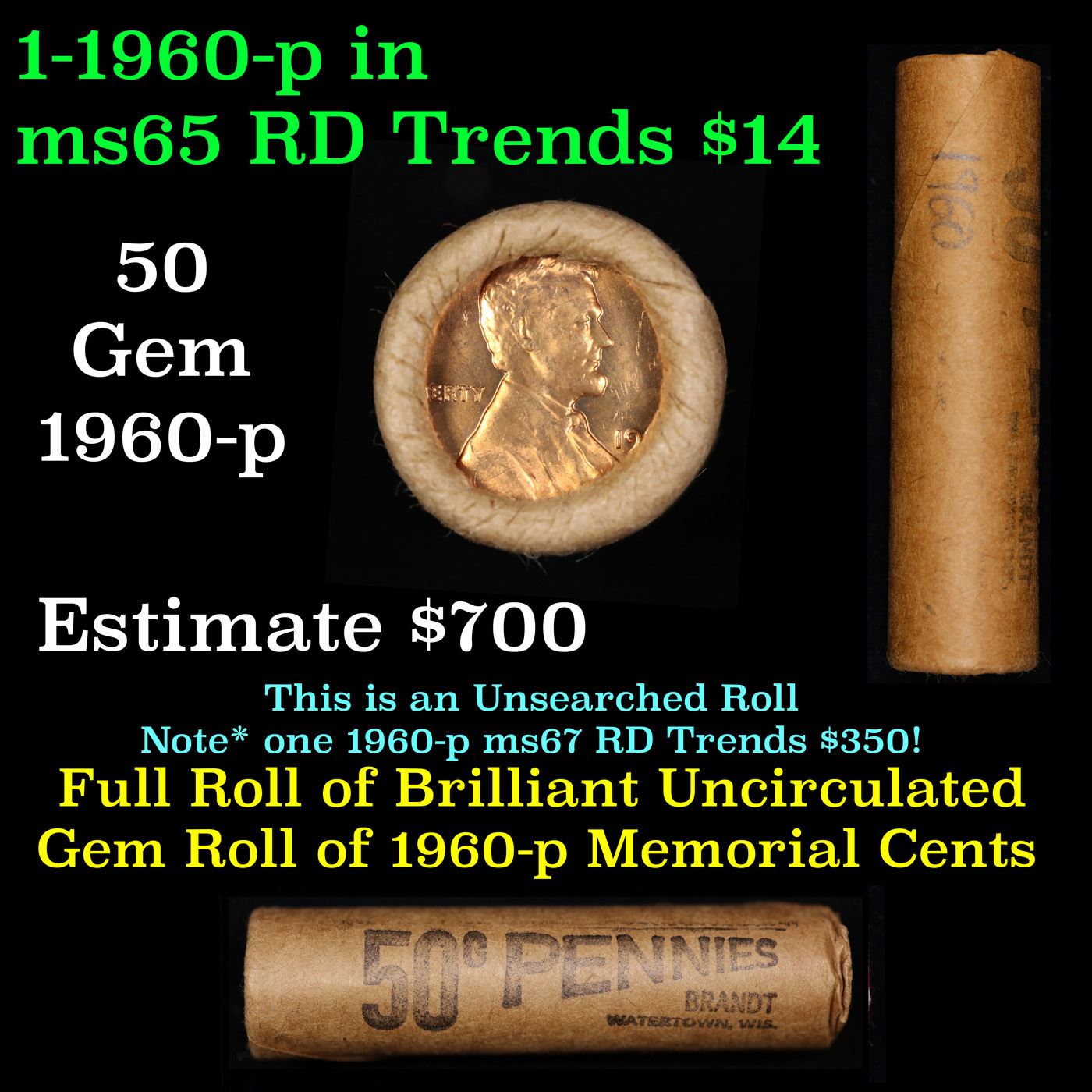 Shotgun Lincoln 1c roll, 1960-p 50 pcs Brandt Wrapper.. A terrific Shotgun roll of Lincoln cents. Most if not all coin should be cherry red. Trends ms65 rd $14