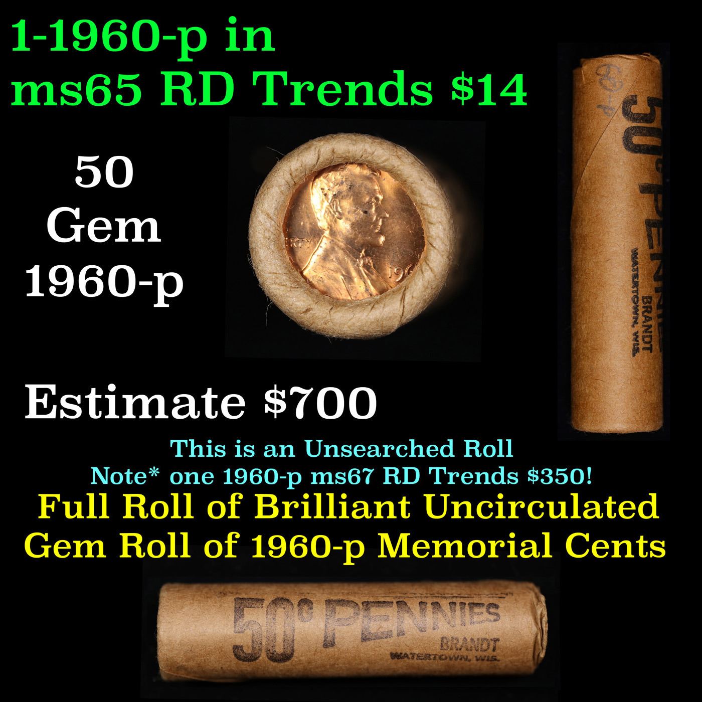 Shotgun Lincoln 1c roll, 1960-p 50 pcs Brandt Wrapper.. A terrific Shotgun roll of Lincoln cents. Most if not all coin should be cherry red. Trends ms65 rd $14