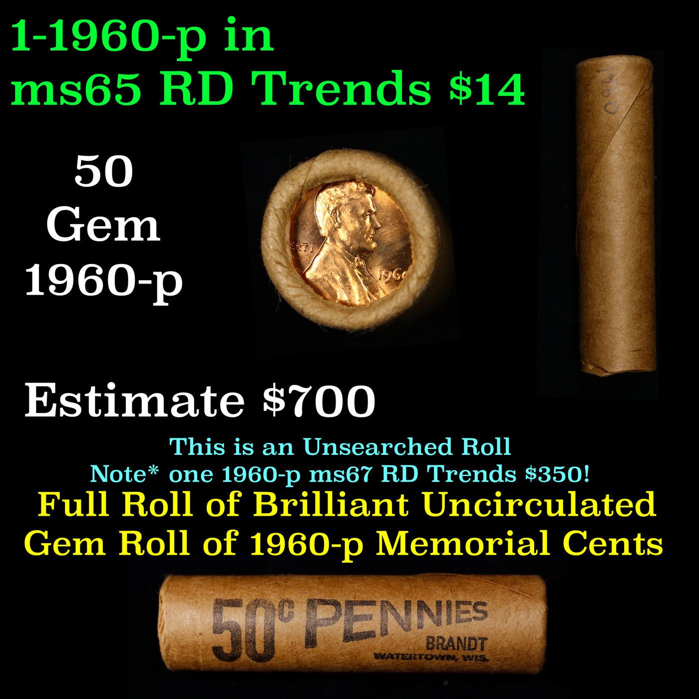 Shotgun Lincoln 1c roll, 1960-p 50 pcs Brandt Wrapper.. A terrific Shotgun roll of Lincoln cents. Most if not all coin should be cherry red.