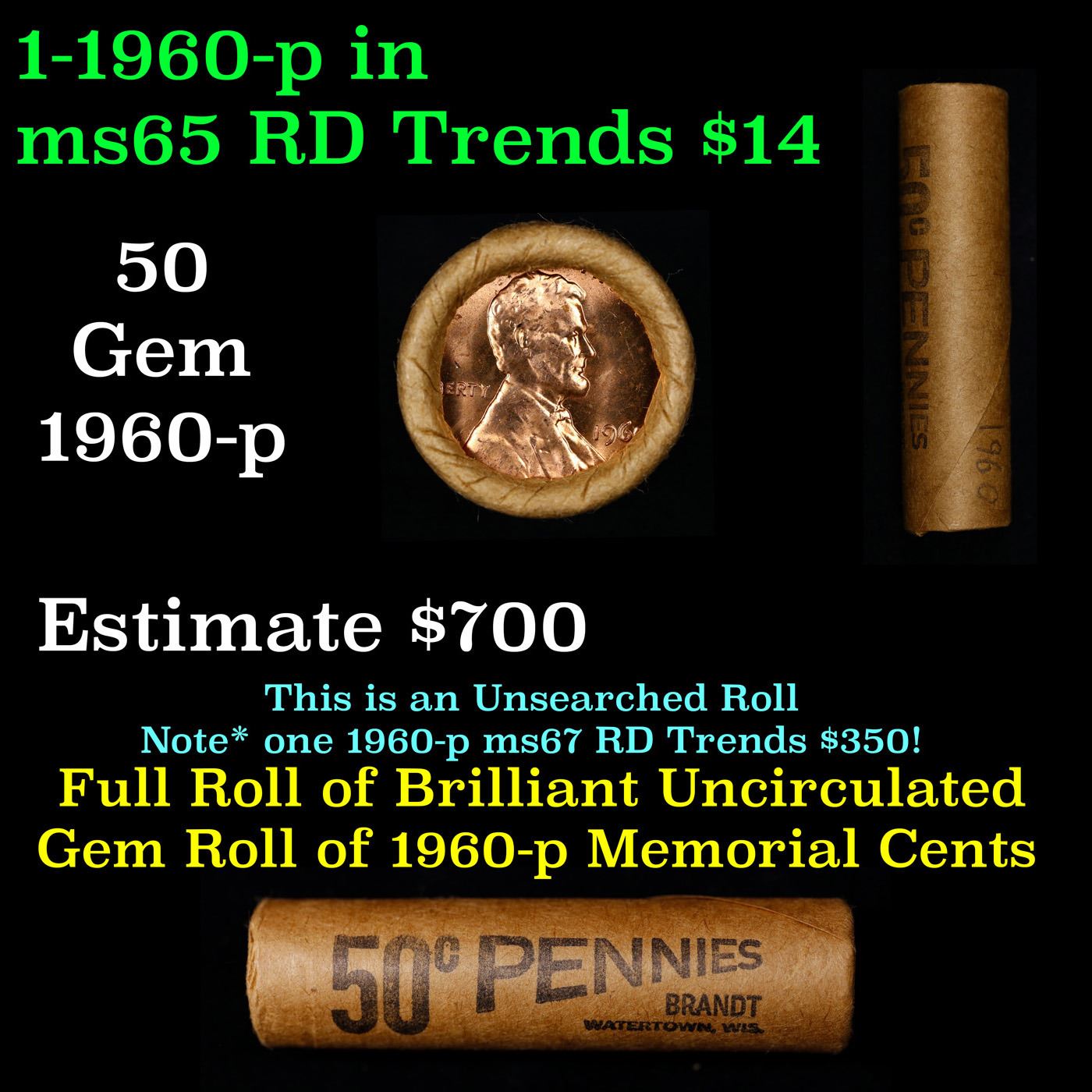 Shotgun Lincoln 1c roll, 1960-p 50 pcs Brandt Wrapper.. A terrific Shotgun roll of Lincoln cents. Most if not all coin should be cherry red.