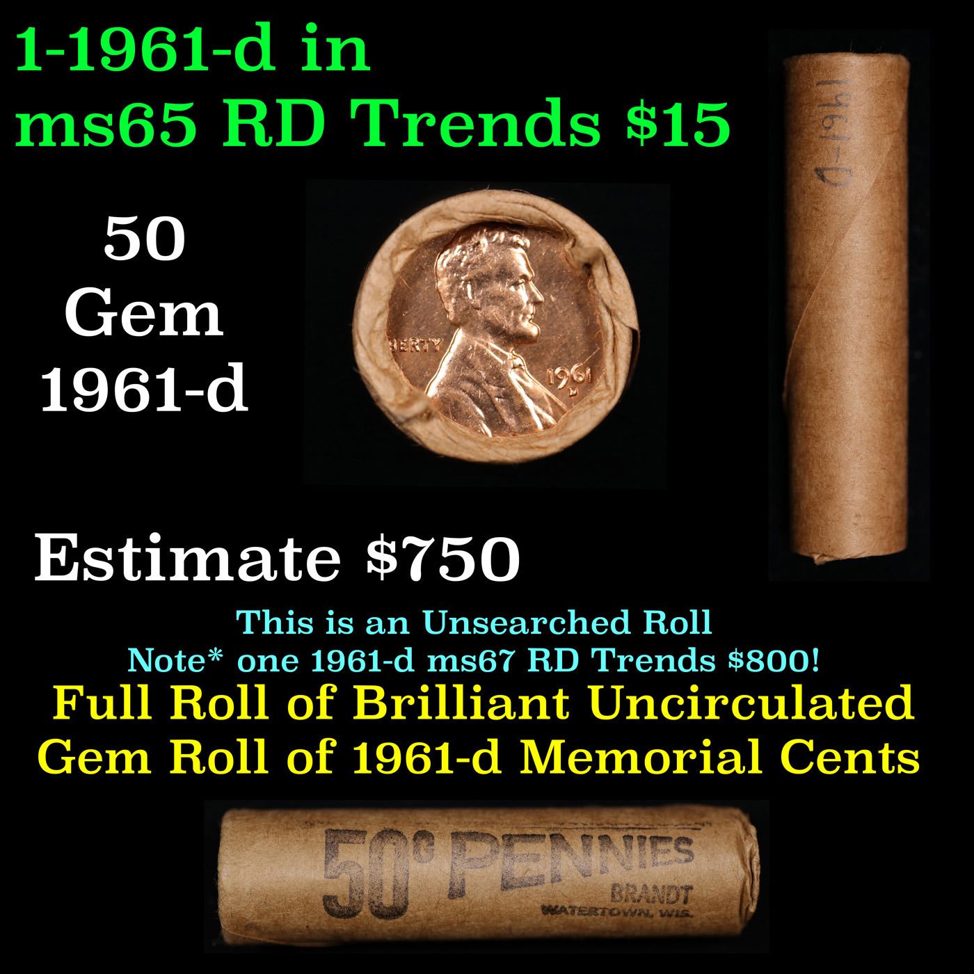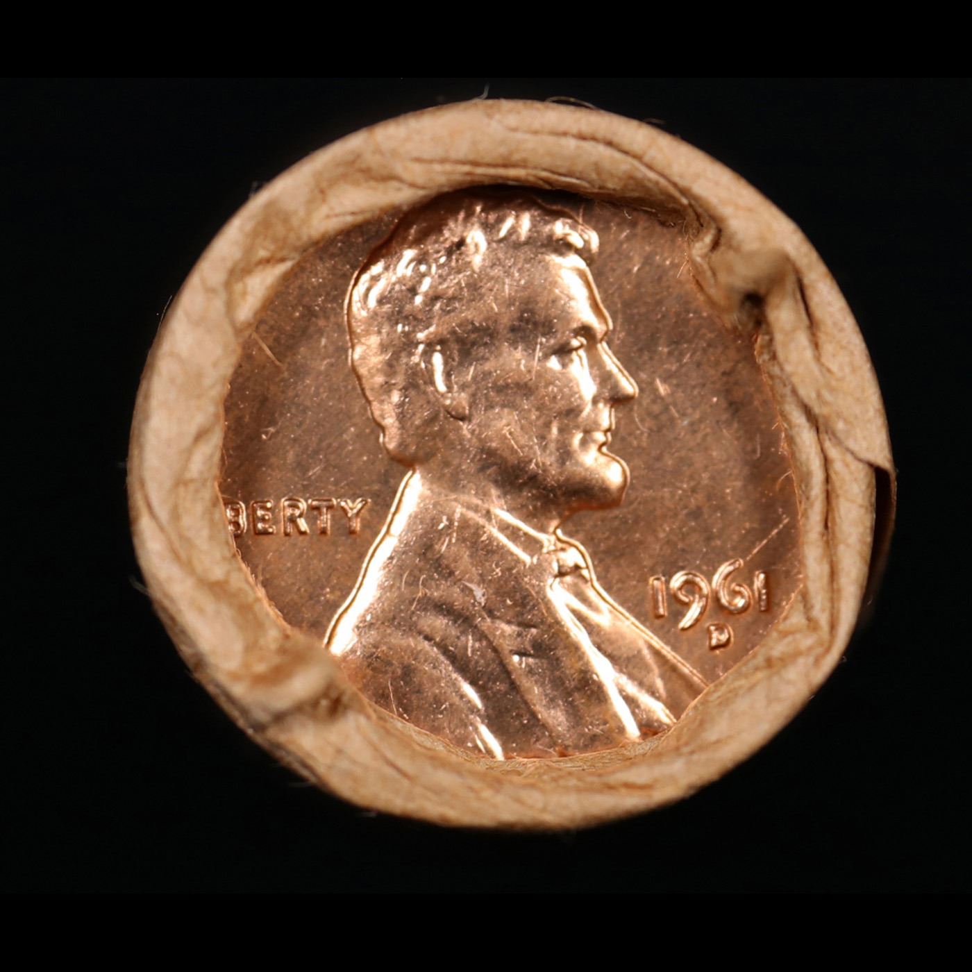 Shotgun Lincoln 1c roll, 1961-D 50 pcs Brandt Wrapper.. A terrific Shotgun roll of Lincoln cents. Most if not all coin should be cherry red.