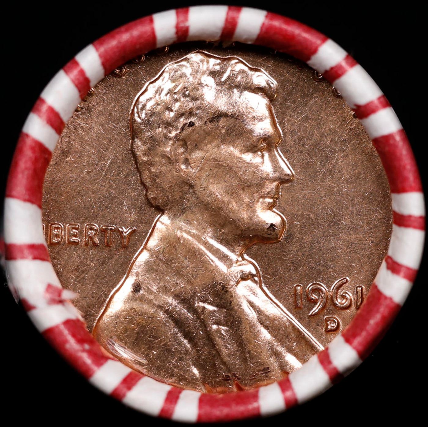 Shotgun Lincoln 1c roll, 1961-d 50 pcs Bank 50c Wrapper.. A terrific Shotgun roll of Lincoln cents. Most if not all coin should be cherry red.