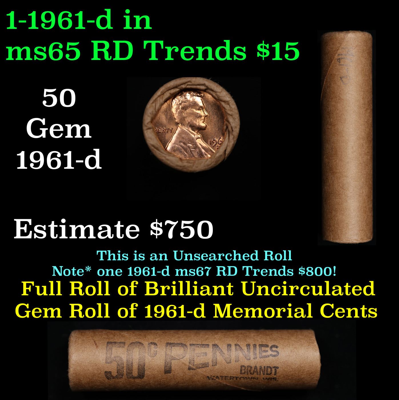 Shotgun Lincoln 1c roll, 1961-d 50 pcs Bank Wrapper.. A terrific Shotgun roll of Lincoln cents. Most if not all coin should be cherry red.