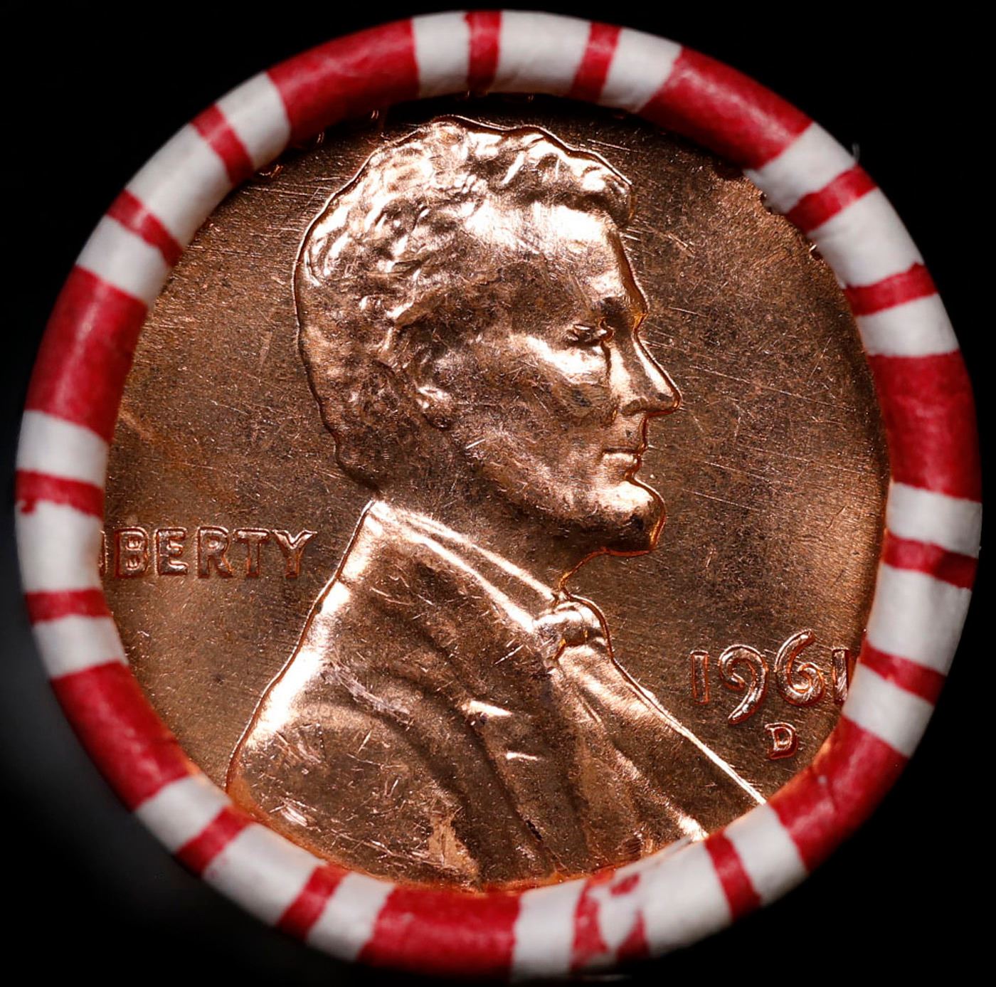 Shotgun Lincoln 1c roll, 1961-d 50 pcs Brandt 50c Wrapper.. A terrific Shotgun roll of Lincoln cents. Most if not all coin should be cherry red.