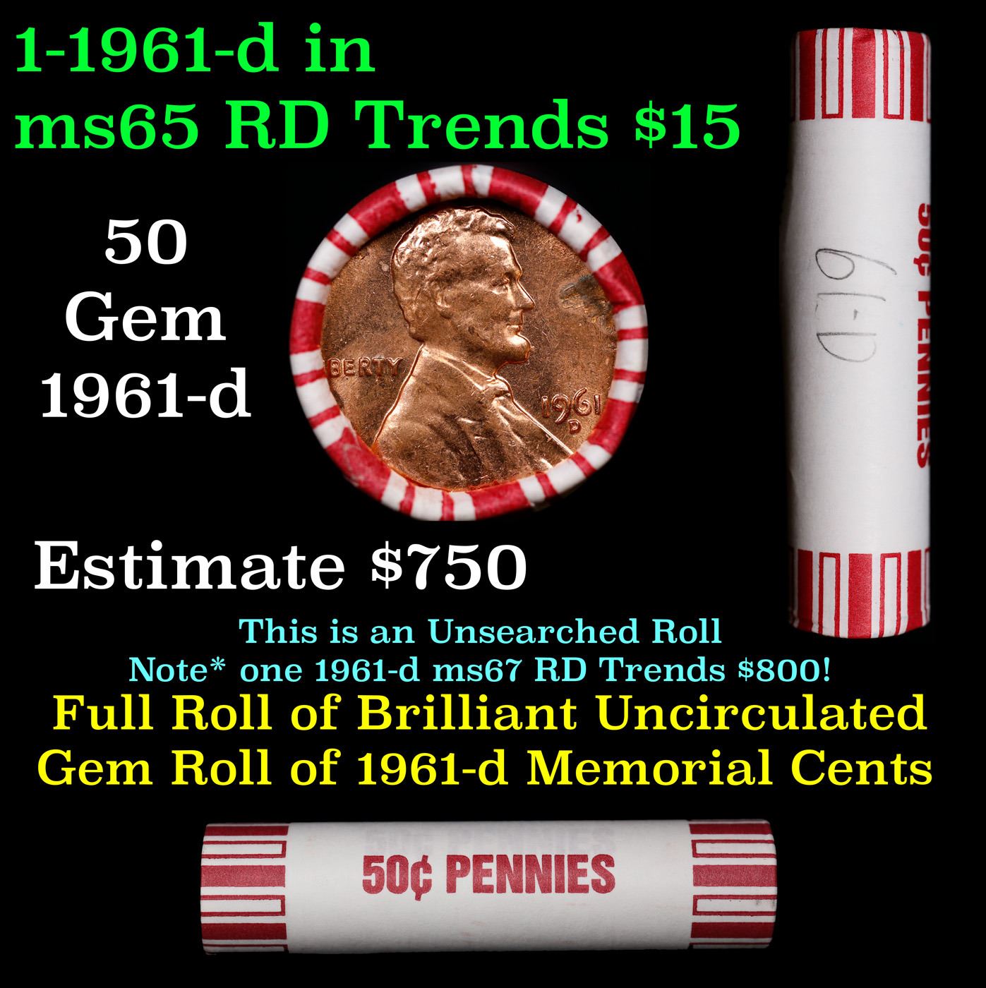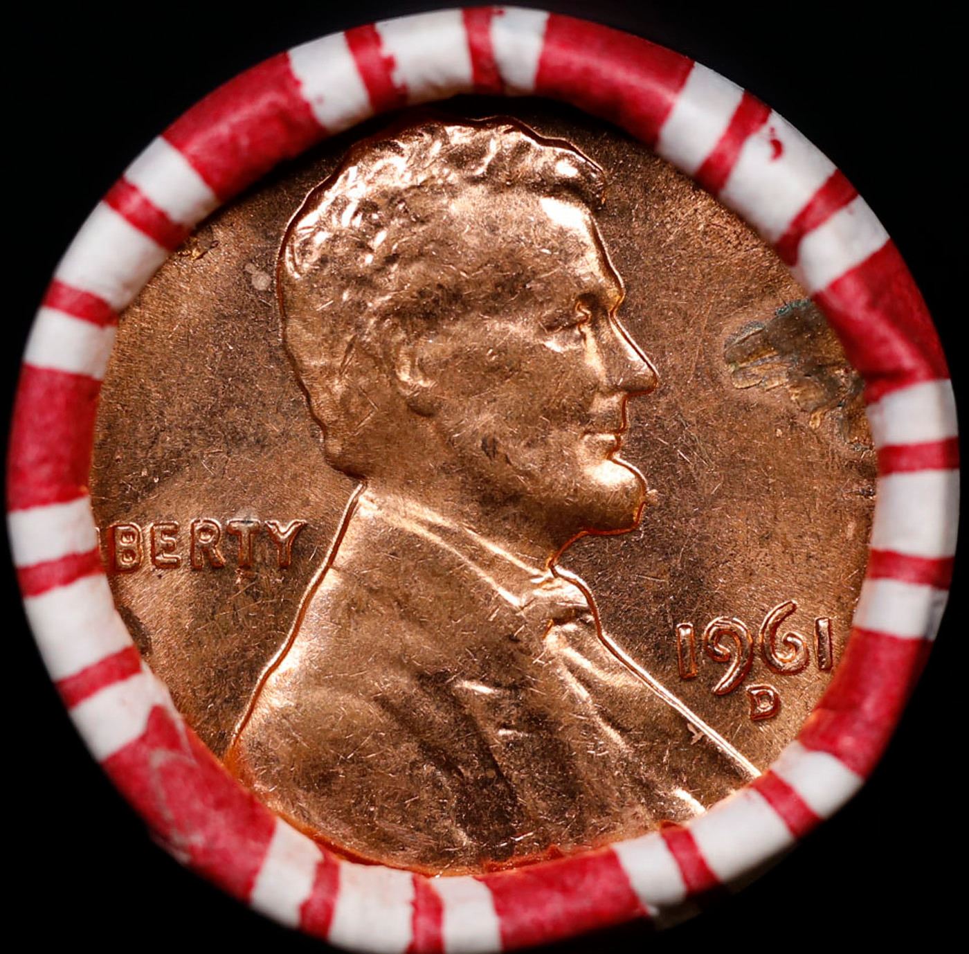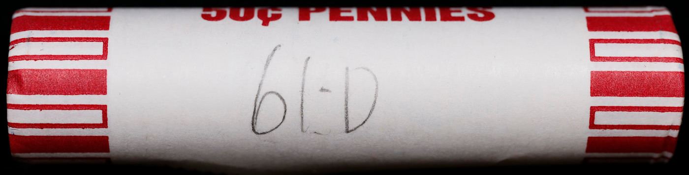 Shotgun Lincoln 1c roll, 1961-d 50 pcs Brandt 50c Wrapper.. A terrific Shotgun roll of Lincoln cents. Most if not all coin should be cherry red.