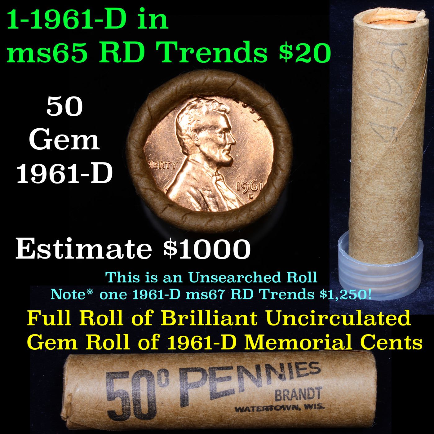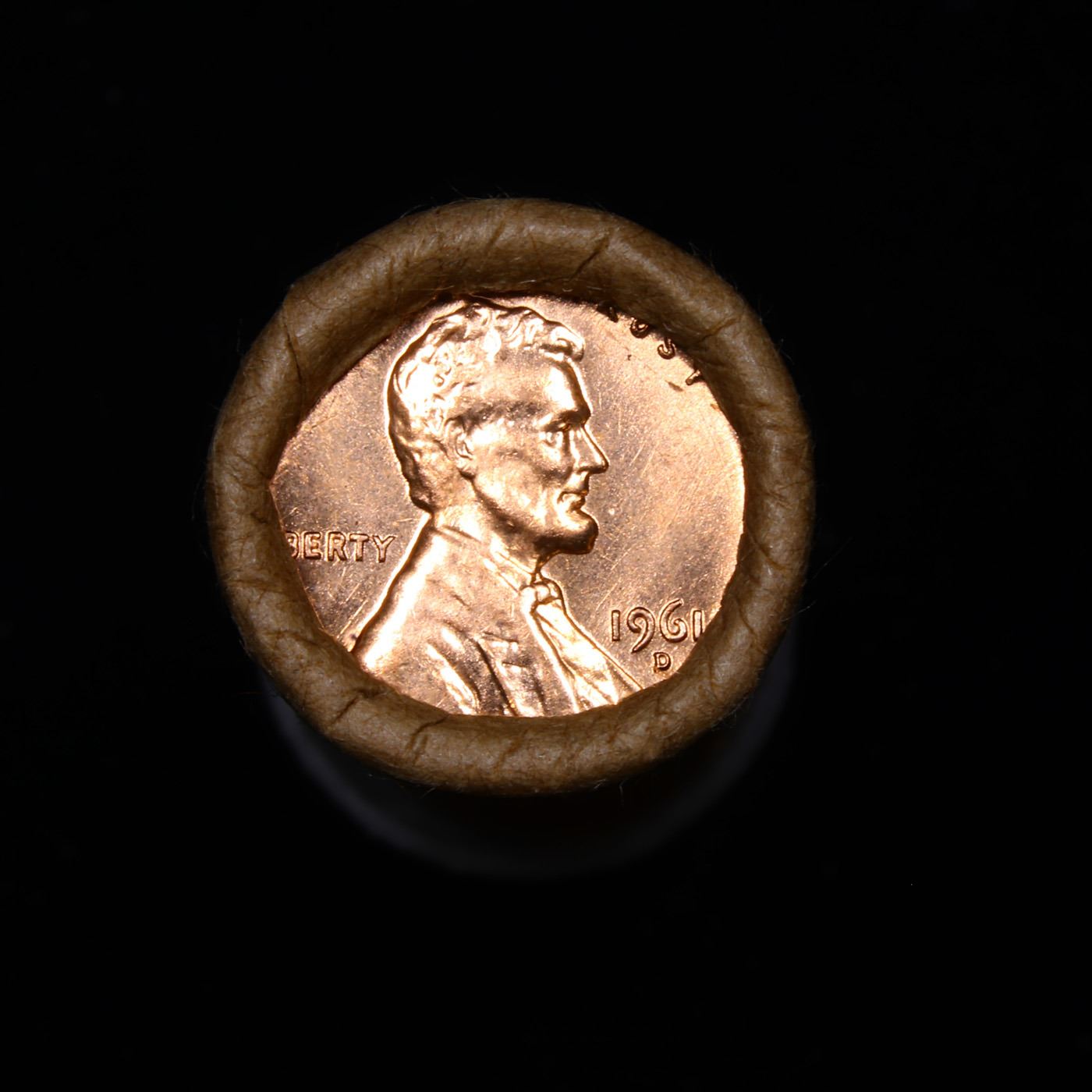 Shotgun Lincoln 1c roll, 1961-d 50 pcs Brandt Wrapper . A terrific Shotgun roll of Lincoln cents. All coins cherry red. Trends ms65 rd $20 Estimate $1000