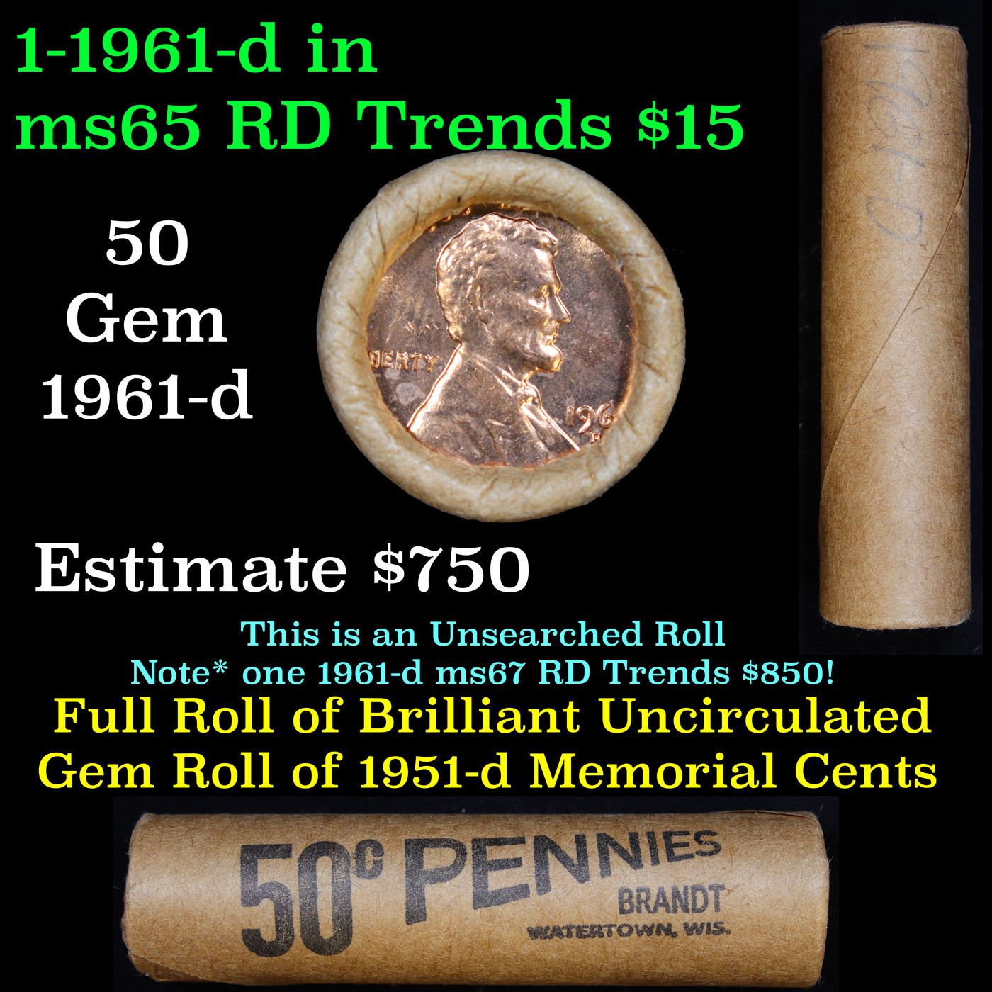 Shotgun Lincoln 1c roll, 1961-d 50 pcs Brandt Wrapper . A terrific Shotgun roll of Lincoln cents. All coins cherry red. Trends ms65 rd $15