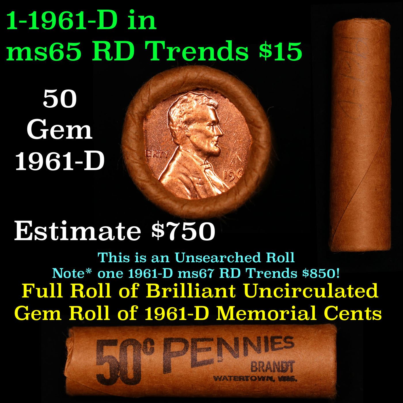 Shotgun Lincoln 1c roll, 1961-d 50 pcs Brandt Wrapper . A terrific Shotgun roll of Lincoln cents. All coins cherry red. Trends ms65 rd $15