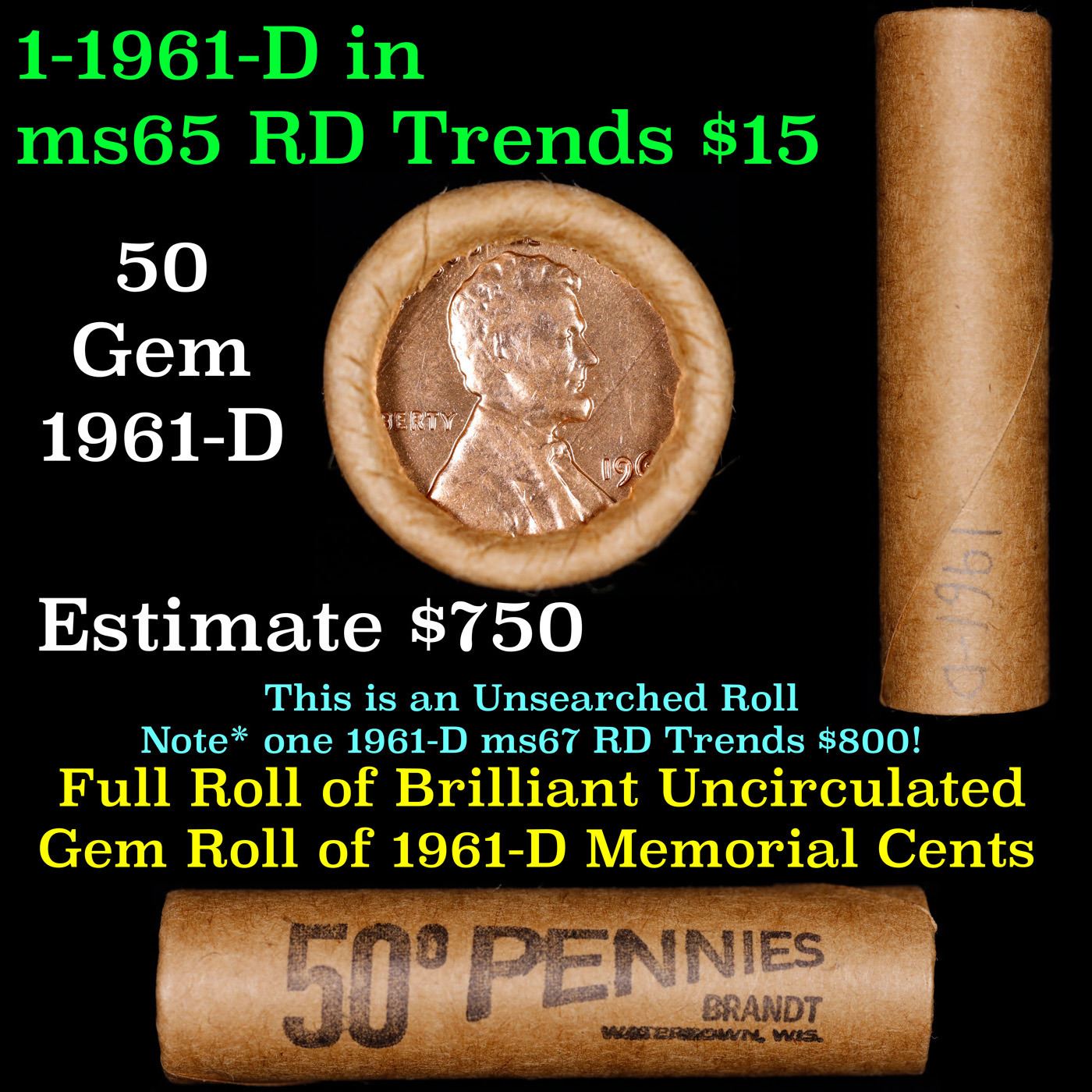 Shotgun Lincoln 1c roll, 1961-d 50 pcs Brandt Wrapper . A terrific Shotgun roll of Lincoln cents. All coins appear to be cherry red. Trends ms65 rd $15