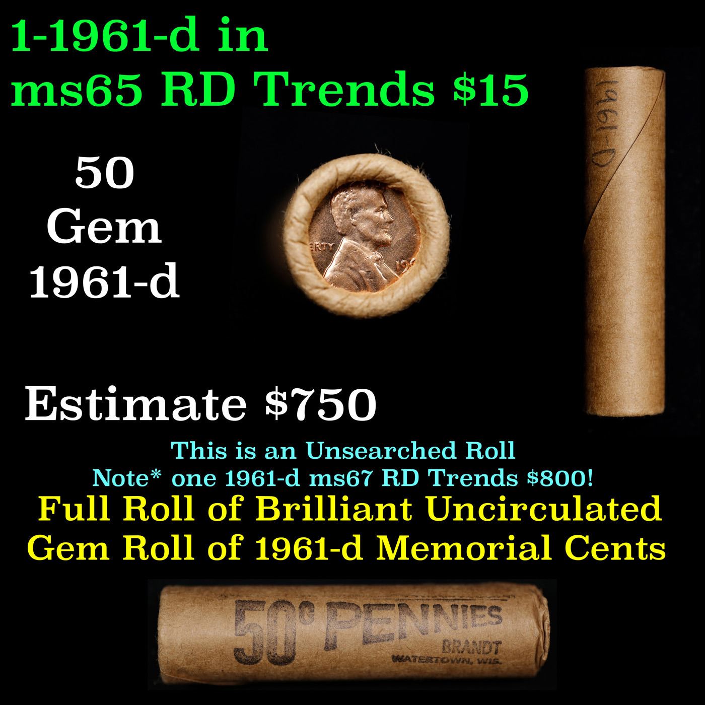 Shotgun Lincoln 1c roll, 1961-d 50 pcs Brandt Wrapper.. A terrific Shotgun roll of Lincoln cents. Most if not all coin should be cherry red.