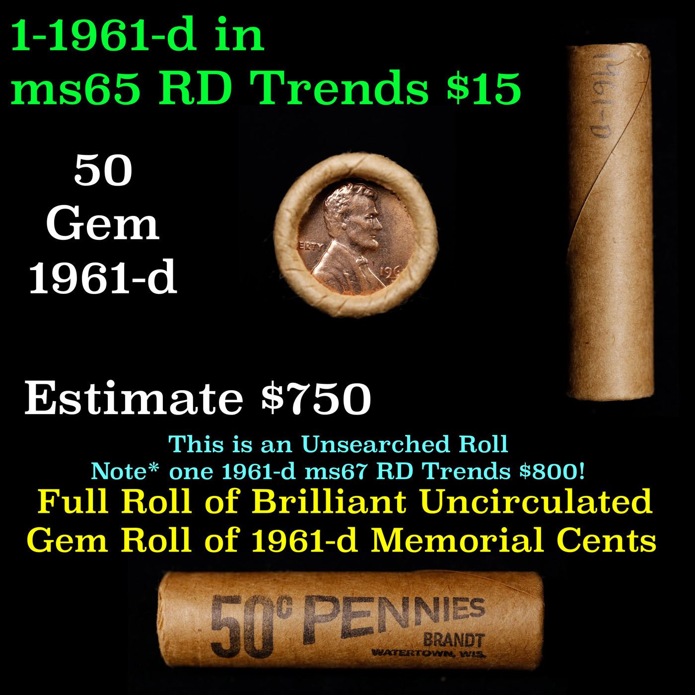 Shotgun Lincoln 1c roll, 1961-d 50 pcs Brandt Wrapper.. A terrific Shotgun roll of Lincoln cents. Most if not all coin should be cherry red.