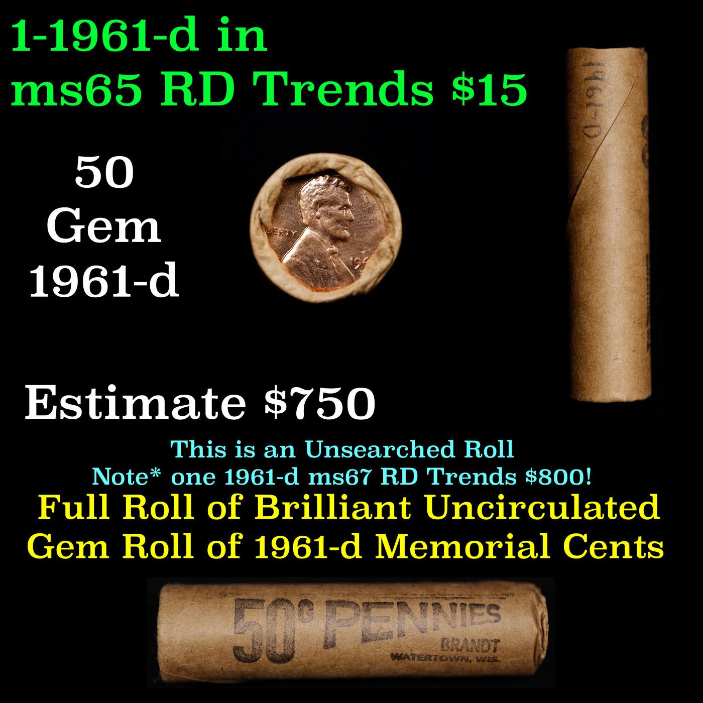 Shotgun Lincoln 1c roll, 1961-d 50 pcs Brandt Wrapper.. A terrific Shotgun roll of Lincoln cents. Most if not all coin should be cherry red.