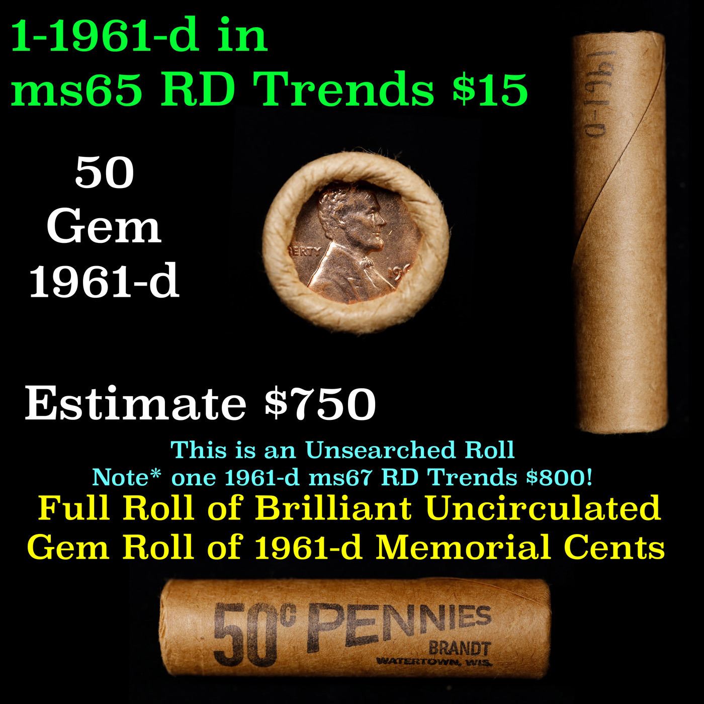 Shotgun Lincoln 1c roll, 1961-d 50 pcs Brandt Wrapper.. A terrific Shotgun roll of Lincoln cents. Most if not all coin should be cherry red.